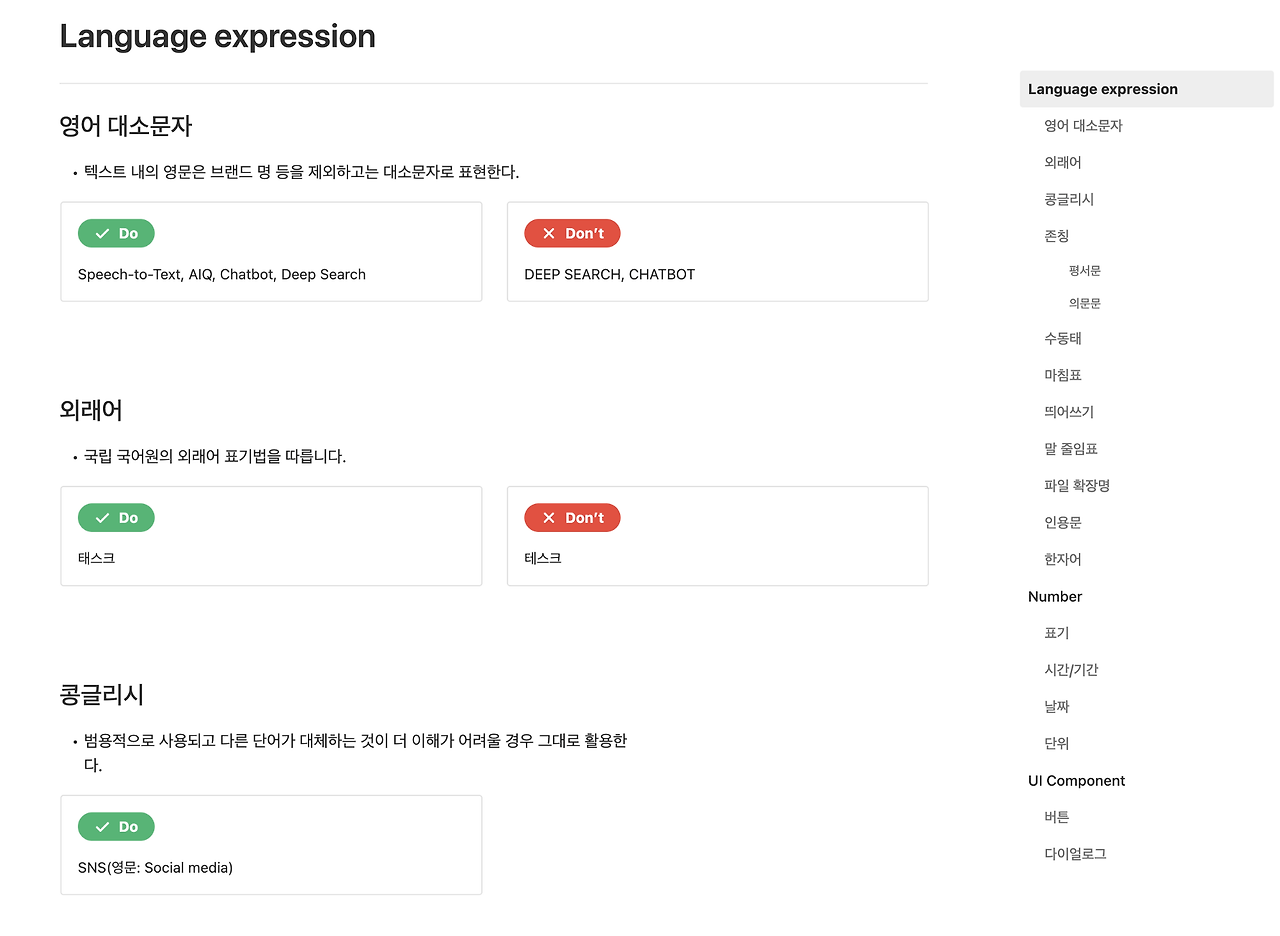 업무를 진행하다 보면 범용적으로 사용하는 단어나 문장도 서로간의 이해가 달라 혼동이 올 수 있습니다. 국립국어원을 기준으로 해도 세세한 상황에 따라 의문문을 표현하는 방식이나 인용문 등을 표기하는 방식이 다를 수 있어서 기준을 다시 정리해야 했습니다. 하단 이미지는 그 내용을 일부 발췌한 이미지입니다.