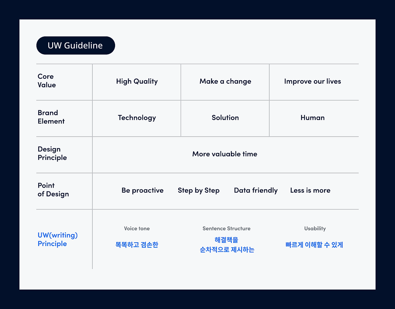 Point of Design에서 잡은 4가지 원칙들을 녹여 UW Principle의 보이스 톤(Voice Tone), 문장 구조(Sentence Structure), 사용성(Usability)의 3가지 방향성에 적용하였습니다.