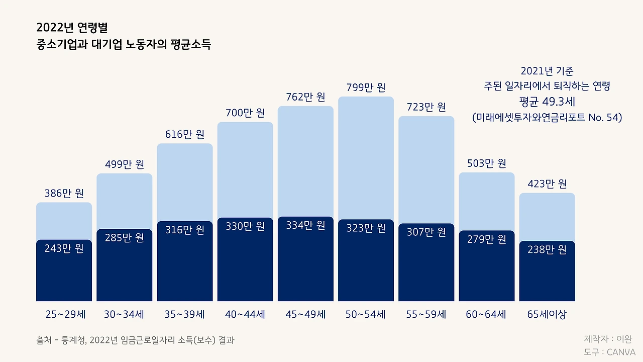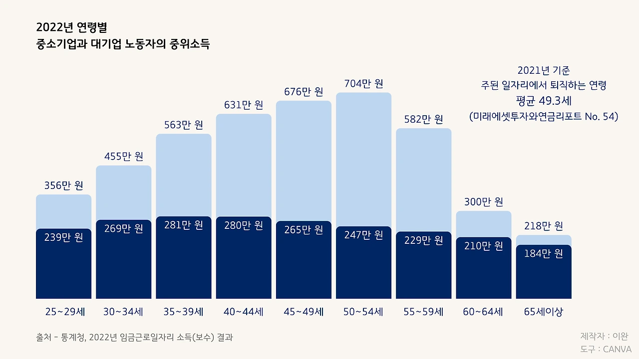 남자의 경우, 고등학교를 졸업하자마자 4년제 대학에 들어가고 군대까지 다녀오면 만 25세 즈음이 된다. 재수를 하거나 휴학 설계에 실패하면 그 이상일 수도 있다. 25세에 곧바로 중소기업에 취업하면, 40대 즈음에 월급의 정점을 찍는다. 그래봐야 대기업 종사자의 절반도 안 되는 수준이지만, 아무튼 이후로는 쭉 하락세다.