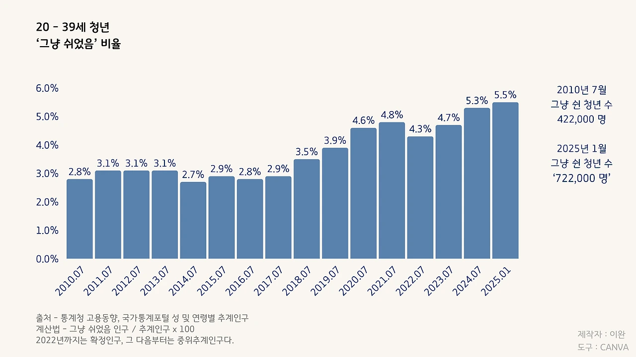 2010년에서 2025년 사이에 청년 인구는 1,500만 명에서 1,300만 명 수준으로 줄었다. 그런데 같은 기간 동안 특별한 이유 없이 학교도 다니지 않고 취업도 준비하지 않는 청년은 42만 명에서 72만 명으로 늘었다. 사람은 누구나 번듯한 사회 구성원으로 인정받고 싶어한다. 그런 욕구를 기본적으로 타고 났다는 것이 심리학계의 중론이다. 그런데 안양시 인구보다 많은 청년이 기본 욕구를 잊고 산다. 자살률과 함께 청년의 정신건강에 문제가 있다는 점을 보여주는 단서가 아닐까.