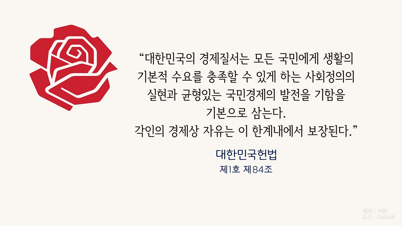 사실 우리나라의 경제 방침은 공산주의와 확실히 거리를 두는 사회주의였다. 우파가 기를 쓰고 외면하는 사실이지만, 우리나라는 광복 전부터 경제 영역에서 상당한 사회주의를 도입할 것을 강령으로 삼고 있었다. 제헌 의회에서는 대놓고 '경제는 사회주의'라고 못박는 발언도 있었고, 제헌 헌법에는 사회정의를 재산권보다 앞에 두는 조항도 있었다. 당시 사람들도 알고 있었듯, 이 조항은 명백하게 사회주의적이었다.