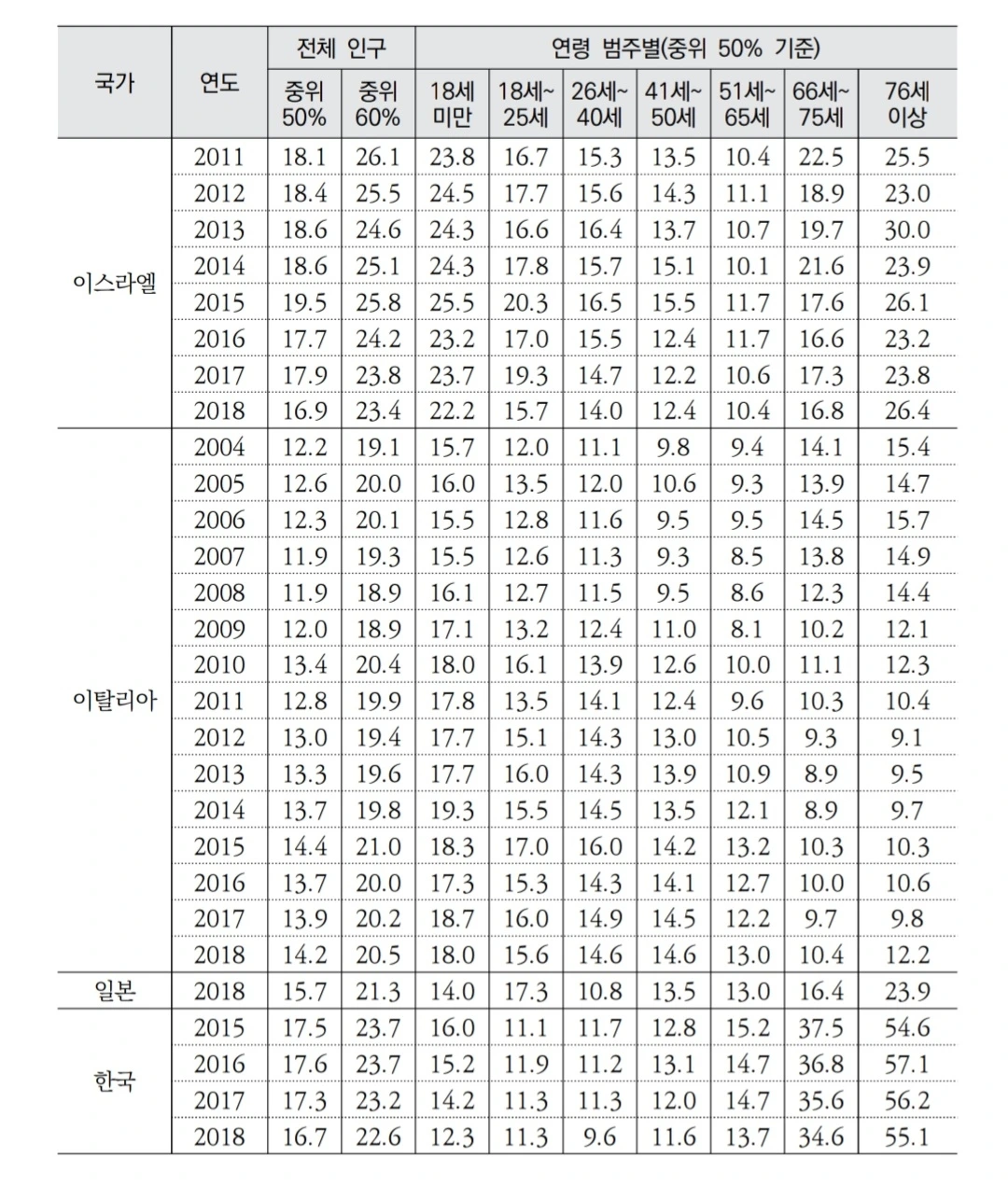 문제는 그 다음입니다. 중년을 맞이하는 시기부터(40세 이상) 서서히 빈곤율이 오르기 시작합니다. 일찍 은퇴하는 사람이 많아져서 그럴지도 모르겠습니다. 그리고 더이상 일하기 힘들 정도로 나이가 들면 빈곤율은 북유럽의 15배로 치솟습니다.