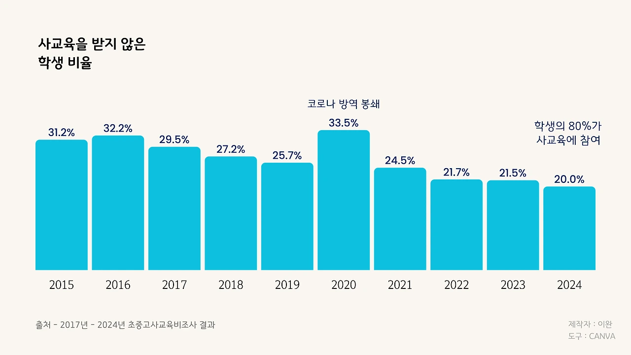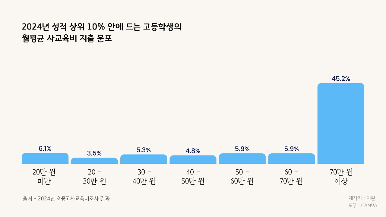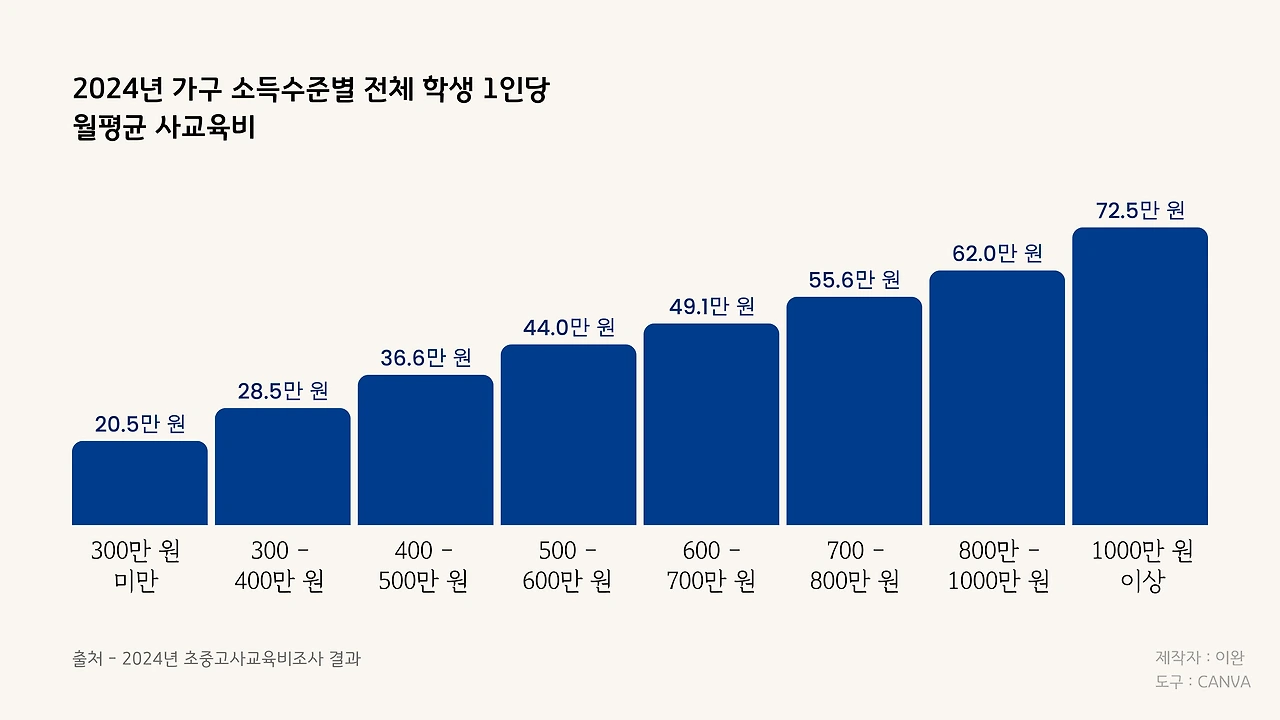 올해 3월 13일, 2024년 초중고사교육비조사 결과가 나왔다. 이제 전체 학생의 80%가 사교육를 받는다. 그 80% 중에서 고등학생의 평균 사교육비는 77만 원이고, 고등학교에서 성적 상위 10% 안에 드는 학생 절반은 사교육비로 한 달에 70만 원 이상을 지출했다. 성적은 사교육비와 어느정도 비례하는데, 사교육비는 가구 소득과 어느정도 비례한다. 대체로 성적은 소득 순인 듯하다.우리는 '기회균등'과 계속 멀어지고 있다.