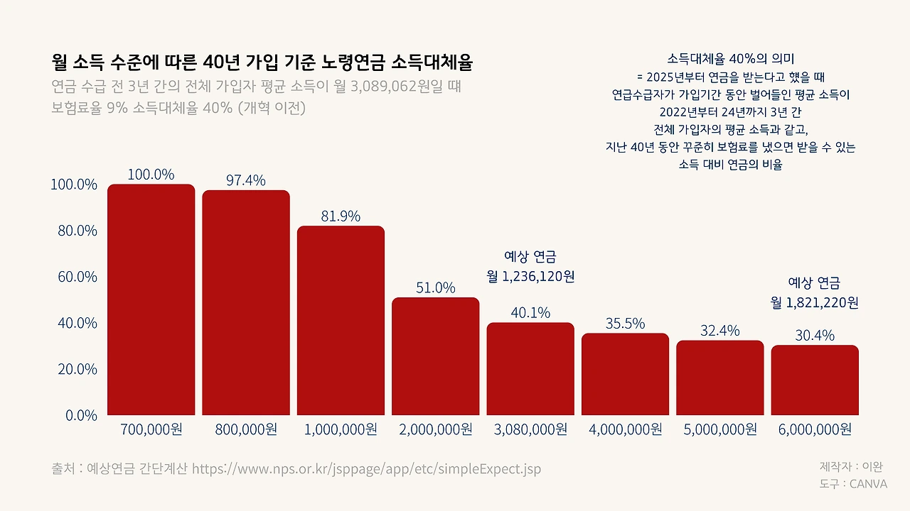 다시 말해, 진짜 기득권 중년은 보험금으로 따지면 다른 사람보다 더 많이 기여하고 소득대체율로 따지면 더 적게 받을 예정이다. 소득대체율을 소급 적용받아도 마찬가지다. 더 많이 기여한 사람이 기여에 비해 적게 받아가니, 소득대체율 인상을 기득권의 마지막 한탕, 엄청난 불공정 행위라고 부르기 어렵다.