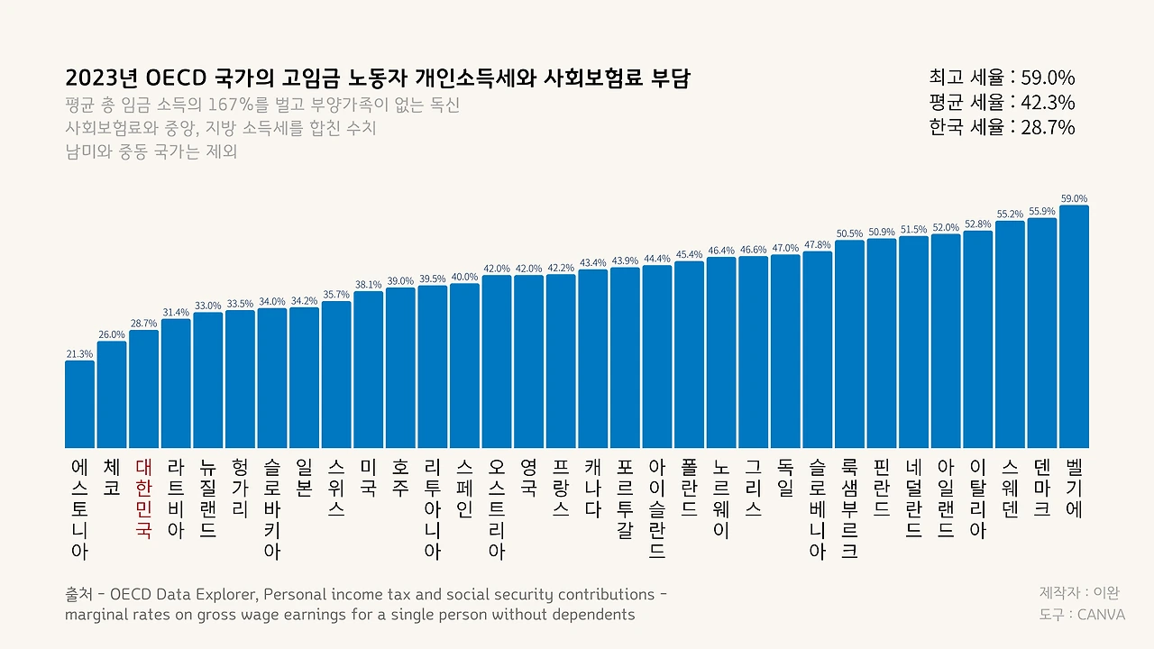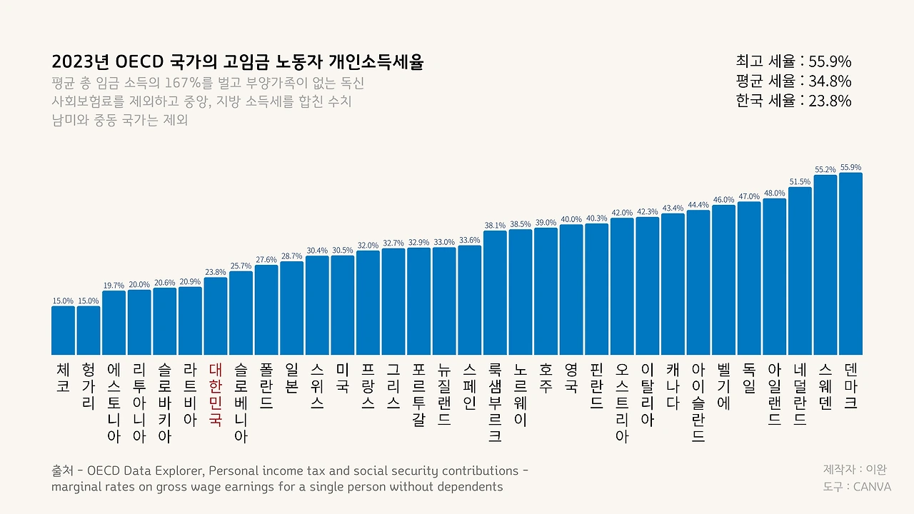 지금까지 세금과 사회보험료가 너무 낮았다. 우리나라 상위 10%는 영국 상위 50%보다 소득세를 적게 낸다. 저소득층은 다른 나라 극빈층만큼 세금을 부담한다. 최상위 0.1% 정도를 제외하면, 모든 계층이 서구 선진국보다 적은 세금을 부담한다. 그 탓에 우리 정부는 사회문제에 충분히 개입할 수 없었다. 예를 들어 노인 빈곤은 정부의 노력으로 완화할 수 있는 문제이고 실제로 꽤 완화되고 있지만, 그럼에도 우리나라 노인 빈곤은 주요국 중에서 가장 심각한 편이다. 우리나라는 너무 오랫동안 세금 혐오에 갇혀 있었다. 발전하기 이전에 생존하려면, 무분별한 세금 혐오부터 뛰어넘어야 한다. 작은 정부는 곧 무능한 정부다.