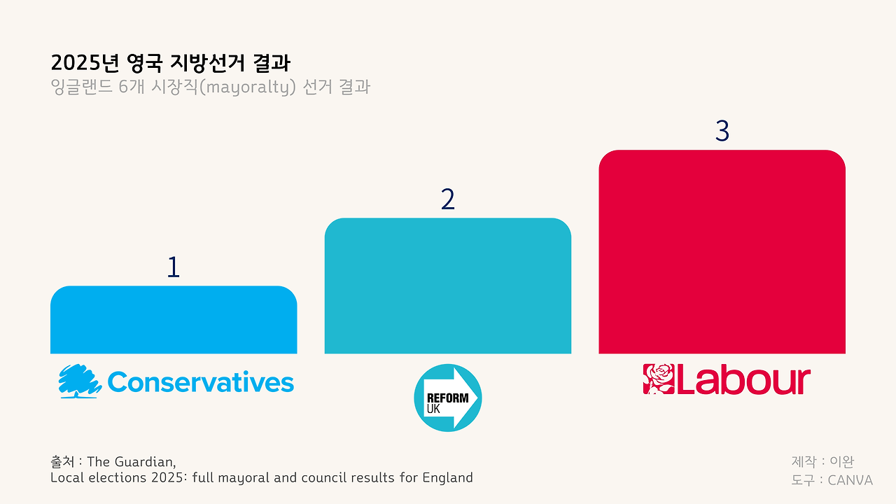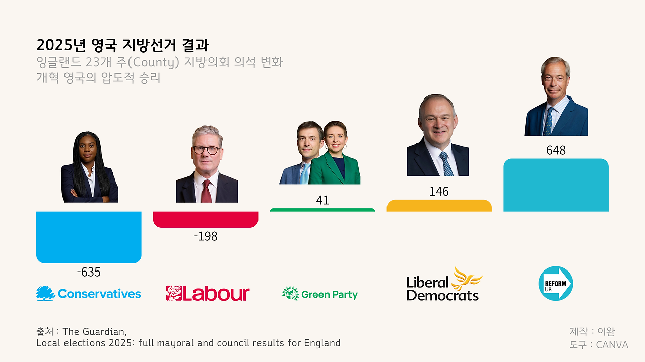 올해 5월 1일 노동절에 영국은 지방선거를 열었다. 잉글랜드에 속한 23개 주의회와 6개 시장직을 새로 채웠다. 서민원 지역구 1개에서 보궐선거도 있었다. 결과는 '개혁 영국'의 압도적 승리다. 잉글랜드 대첩이라고 불러도 좋을 정도다.