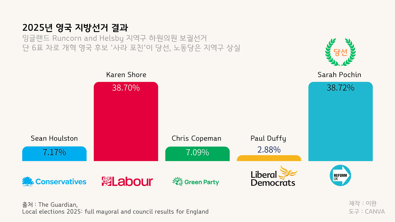 런콘과 헬스비Runcorn and Helsby 지역구의 서민원 보궐선거에서도 개혁 영국의 사라 포친 후보가 당선되었다. 이 지역구는 원래 노동당의 자리였는데, 고작 6표 차이로 개혁 영국에 자리를 내줬다. 국왕 폐하의 정부를 구성하고 있는 노동당 입장에서, 이번 선거는 중간 평가였다. 하지만 노동당은 기존 자리도 지키지 못했다.