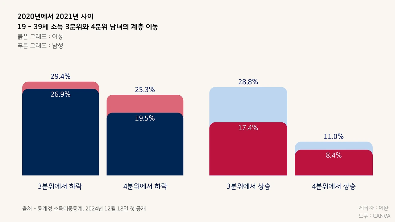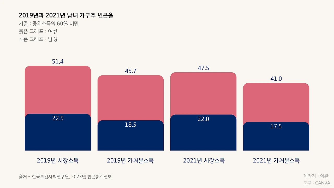 통계에 따르면, 여성 가구주는 남성 가구주보다 빈곤하다. 여성은 남성보다 소득 분위를 지키지 못할 가능성이 크다. 40대 후반을 기준으로 여성의 중위소득은 남성의 절반 수준이다. 한쪽에서는 여성이 저소득을 선택했을 뿐이라고 이야기하지만, 세상에 자발적으로 가난을 선택하는 사람은 그리 많지 않다. 여성이 저소득 직장을 주로 선택하는 원인이 무엇인지, 여성이 비교적 많은 직장이 제대로 임금을 분배하고 있는지를 따져 볼 필요가 있다.