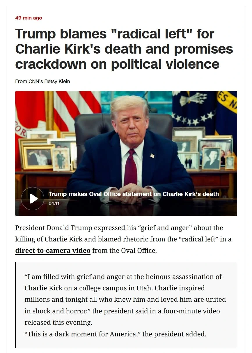 미국에서 총격 사건이 일어났다. 서른 한 살의 기독교 우파 인플루언서, 찰리 커크가 목에 총을 맞았고 곧 병원에서 사망했다.