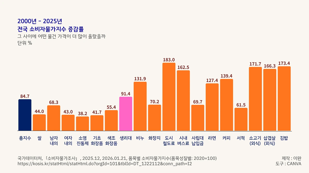 나라 안의 다른 물건과 비교하면 어떨까. 2000년과 2025년을 비교했을 때, 전체 물가는 84.7% 올랐고, 생리대는 91.4% 올랐다. 그런데 위생용품의 알파이자 오메가라고 할 수 있는 비누 가격은 131.9% 올랐다. 도시철도 요금은 무려 183%까지 치솟았다. 관점에 따라서 생리대보다 중요한 생필품이라고 할 수 있는 라면 가격도 127.4%나 상승했다. 과로하는 대학원생과 직장인의 합법 각성제인 커피도 139.4%나 비싸졌다.