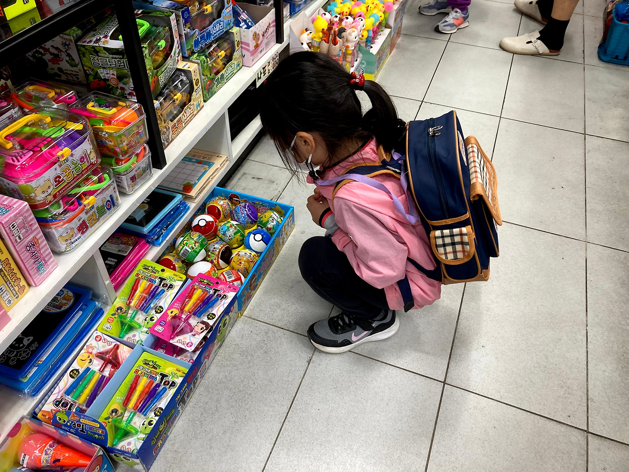 마트 안에 있는 게임기 앞에서 언니와 실랑이를 벌이다 둘째가 삐죽인다. 둘째 용돈은 이미 바닥난 상태고, 언니 용돈으로 게임을 하고 싶었는데 언니가 고민만 하다 거절한 모양이다.