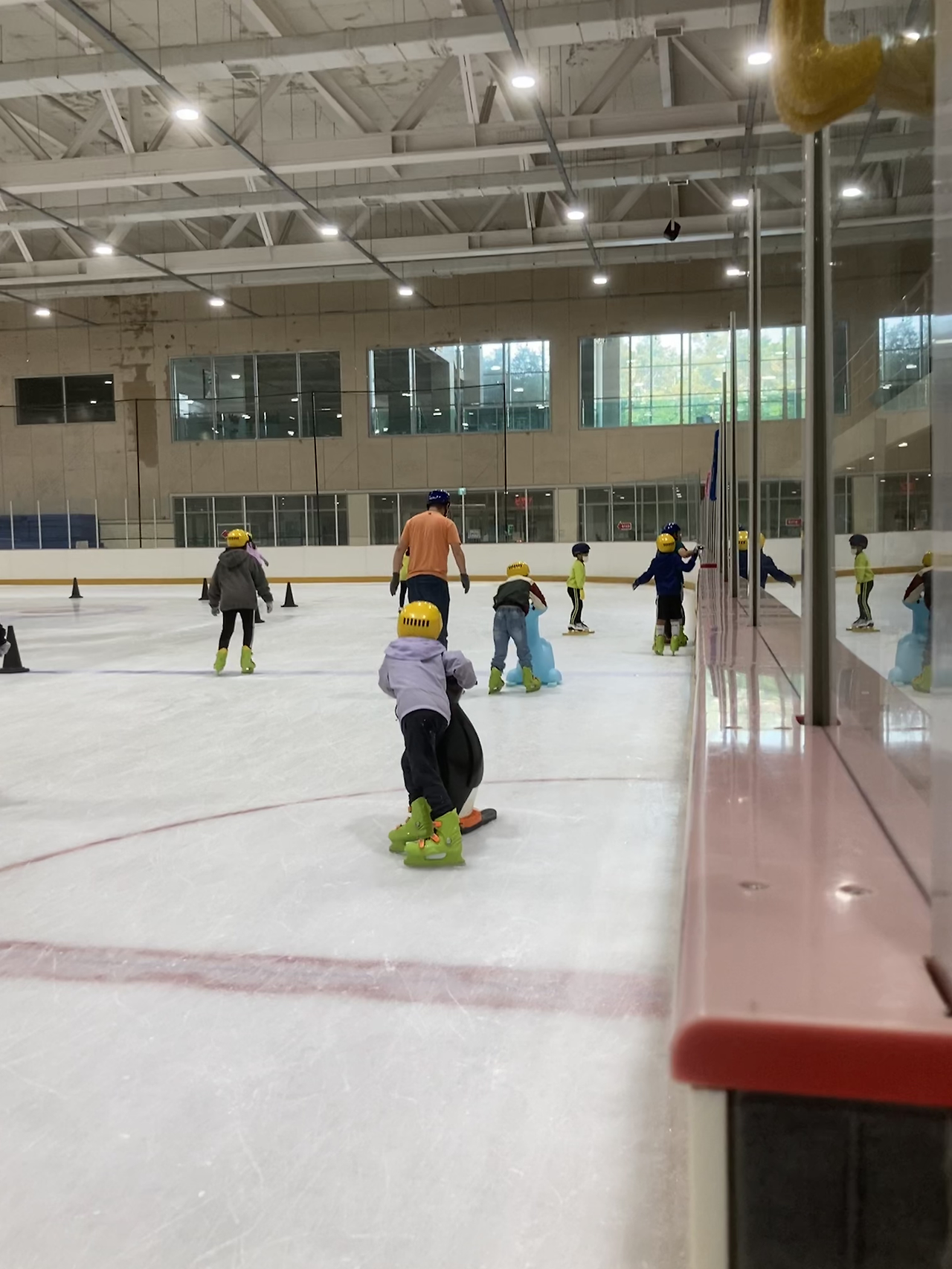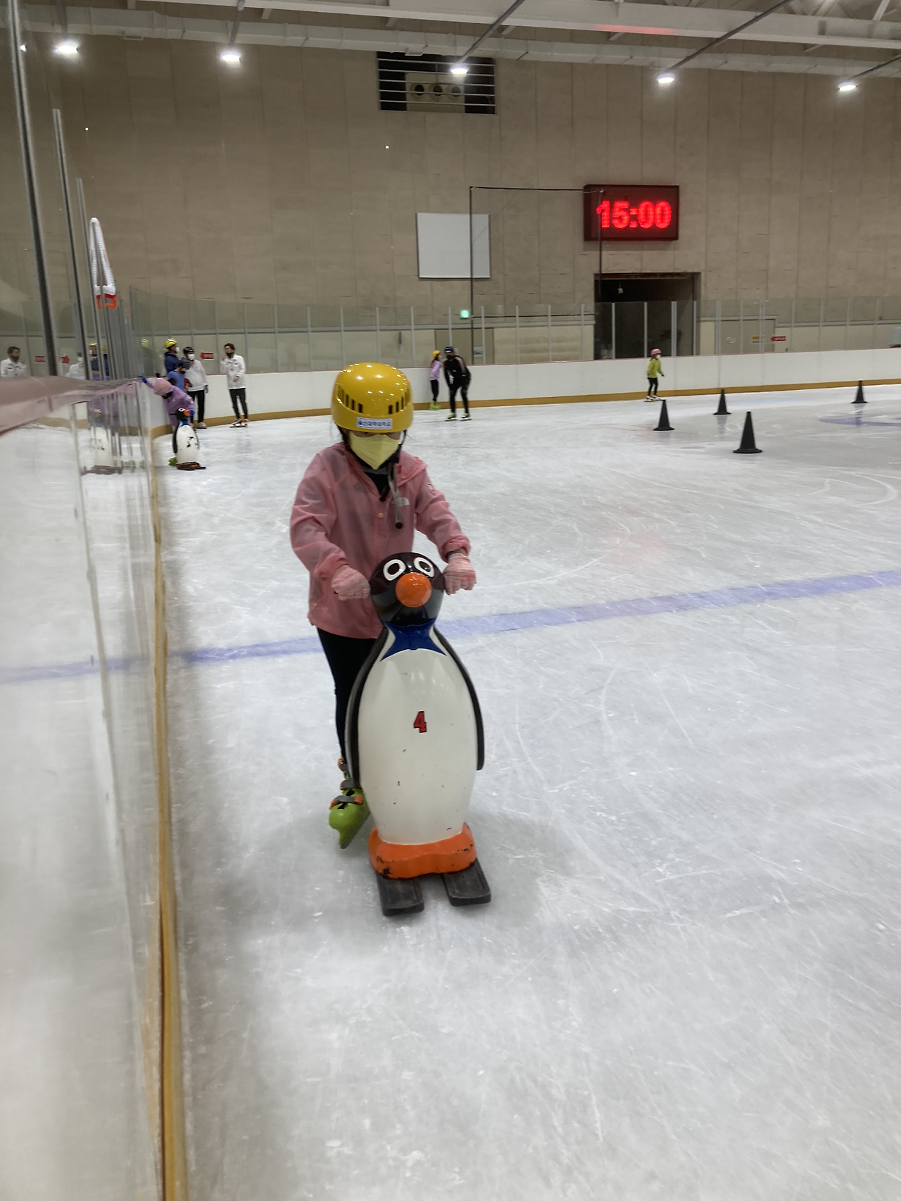 짧은 강습시간이 끝나고 자유 연습 시간이 되었다. 자매는 집에서 타 온 코코아를 한잔씩 마시고 다시 얼음 위로 올라선다. 부축해주시는 선생님이 안 계시니 잡고 갈 수 있는 보조 펭귄을 대여한다. 둘째는 보조 펭귄을 잡고 잘 걷는다. 둘째가 잠깐 쉬는 사이 첫째가 펭귄을 잡고 스케이트를 타기 시작한다.