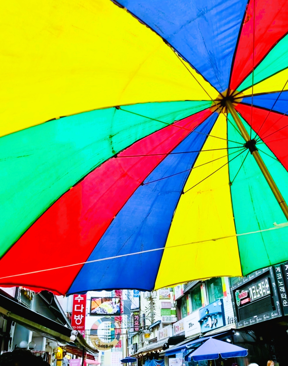 밝았던 태양이 알록달록한 천막에 가려진다. 색색의 천을 고개를 올려 바라보다 다시 앞을 보면 색의 잔상들이 눈앞에 남는다. 빛이 번지고 공 만한 색들이 잠시 눈앞을 스친다. 이상하게 보이는 걸 재밌어하며 몇 번씩 반복한다. 빨리빨리 안 따라오고 한자리에 서서 고갯짓을 하는 내 등 짝에 손바닥이 날아온다. 입을 삐죽이며 엄마와 걷는다.