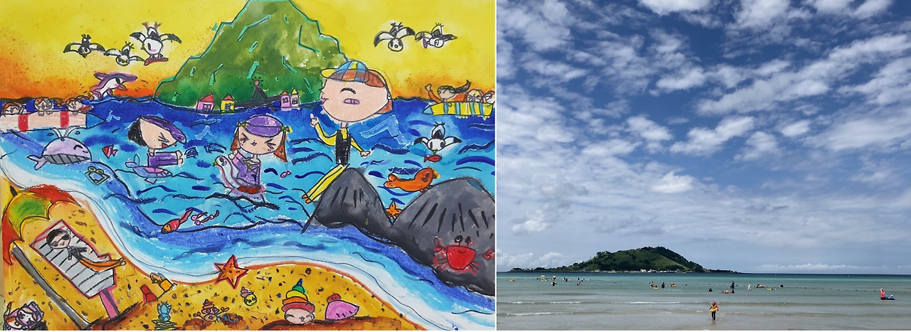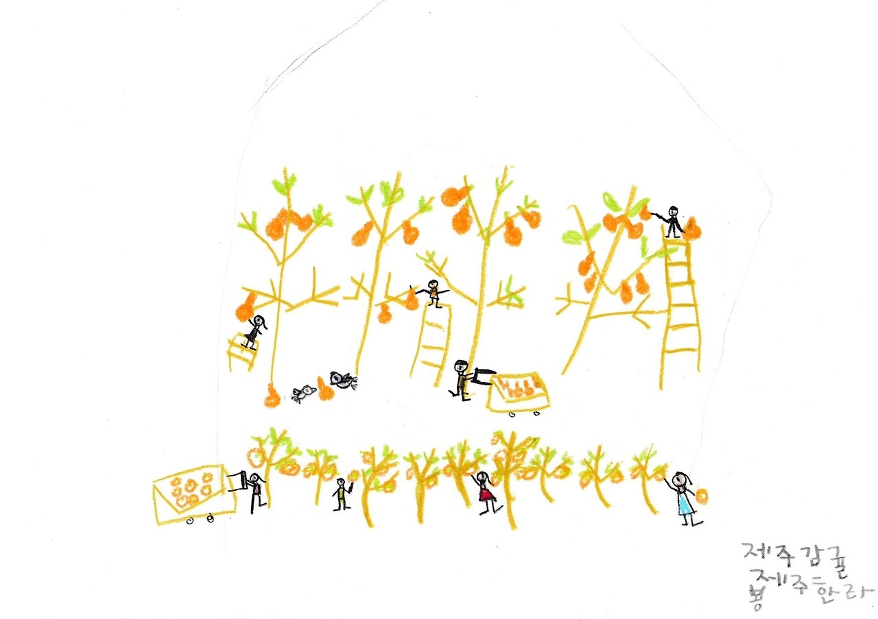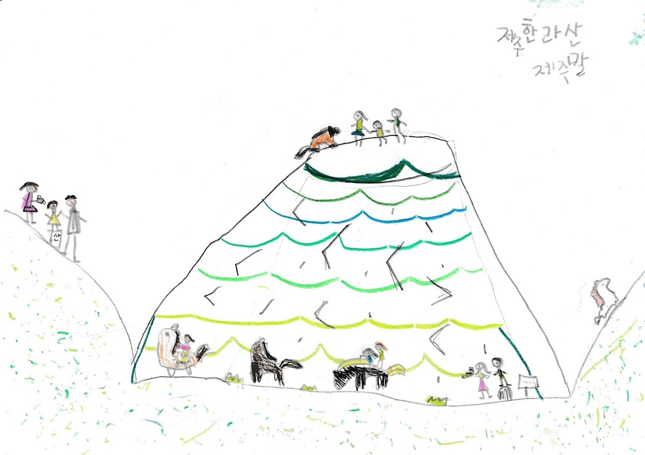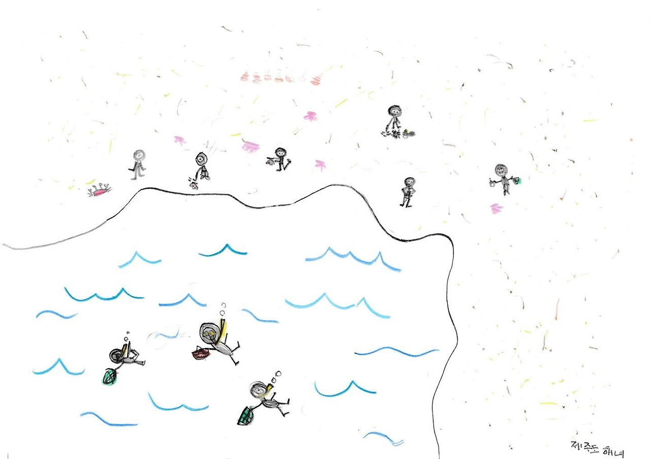 긴 여행을 끝나고 집으로 돌아온 아이는 제주를 대표하는 것들을 쭉 써 내려갔다. 한라산, 말, 한라봉, 해녀, 바다, 동백. 한참을 고민하던 아이는 결심한 듯 눈을 반짝이고는 그림을 그리기 시작했다. 큼직큼직했던 아이 그림 속 주인공은 사라지고 작은 등장인물이 나오기 시작했다. 아이의 작은 스케치북에 오른 큰 변화. 여행으로 얻은 값진 성과다.