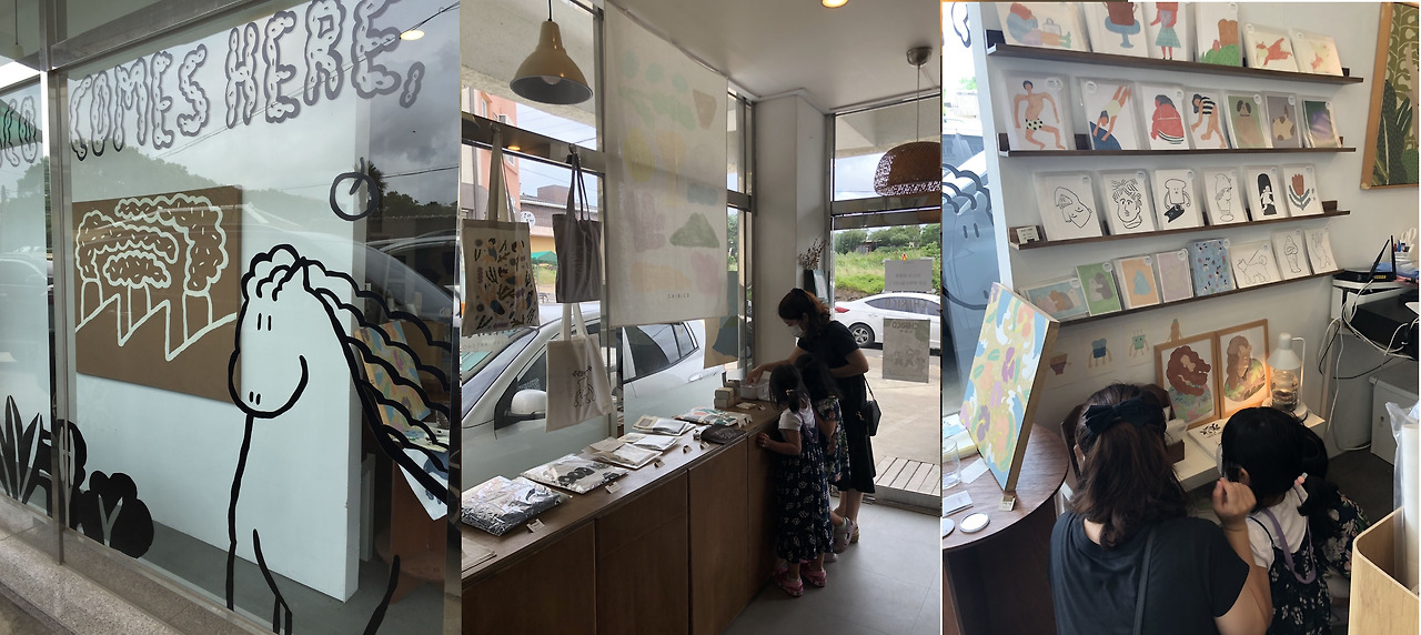 제주 여행 중 화랑을 함께하는 소품샵 "키리코"에 갔다. 작가의 그림은 아이에게 신선한 충격이었다. 미술학원에서 흔히 보았던 화풍이 아니었다. 새로운 선과 다른 색감이 아이를 자극한 듯했다. 그림뿐만이 아니었다. 아이는 그림이 여러 상품으로 변할 수도 있다는 걸 알게 되었다. 수다쟁이 아이는 말도 없이 작은 갤러리를 꼼꼼히 보고 또 보았다.