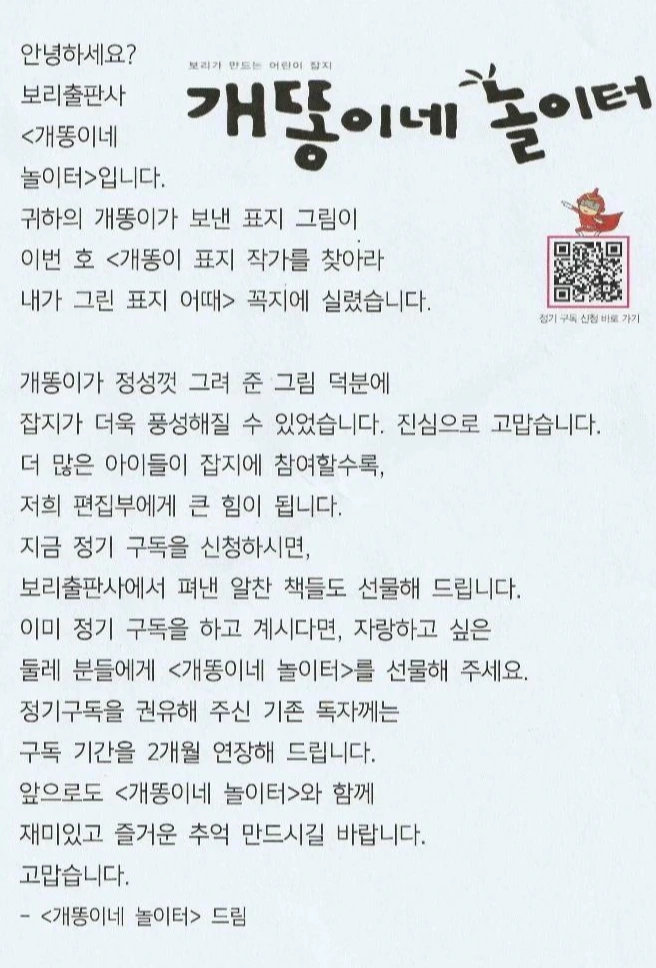 매달 배달된 잡지는 아이들에게 선물 같은 일이 되었다. 아이는 잡지를 꼼꼼히 읽고 붙어있는 엽서의 내용을 채운다. 엽서에 그려진 만화의 말풍선을 채우고 잡지에 실릴 코너에 참여하기도 한다. 이번화에서 재밌었던 내용에 대해서도 쓰고 가끔 고민 이야기도 털어놓는다. 매달 주제에 맞는 표지그림에 도전하기도 한다. 표지 선정에 성공한 적은 없지만 꼭지에 실려 선물을 받기도 했다.
