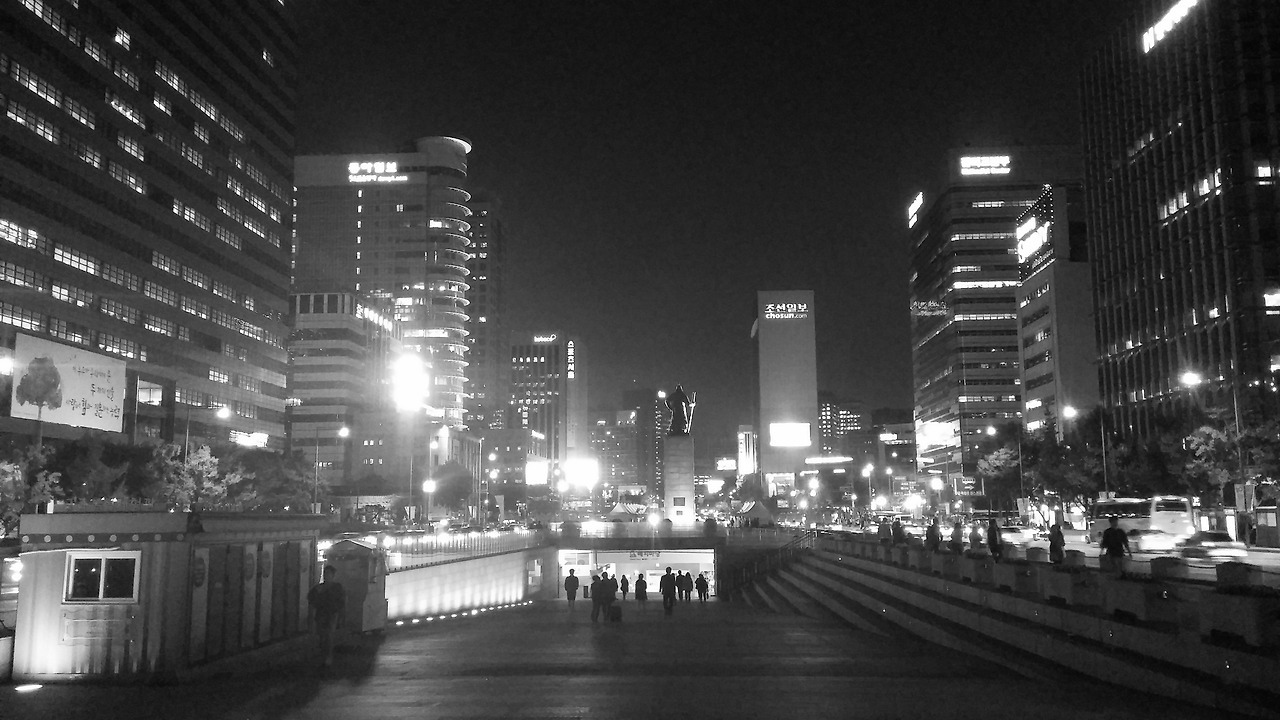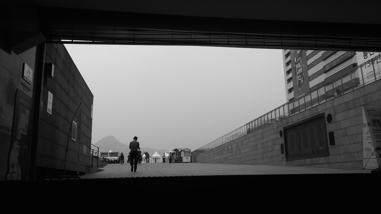 회색 빛 도시에 팔 벌린 빌딩 사이로