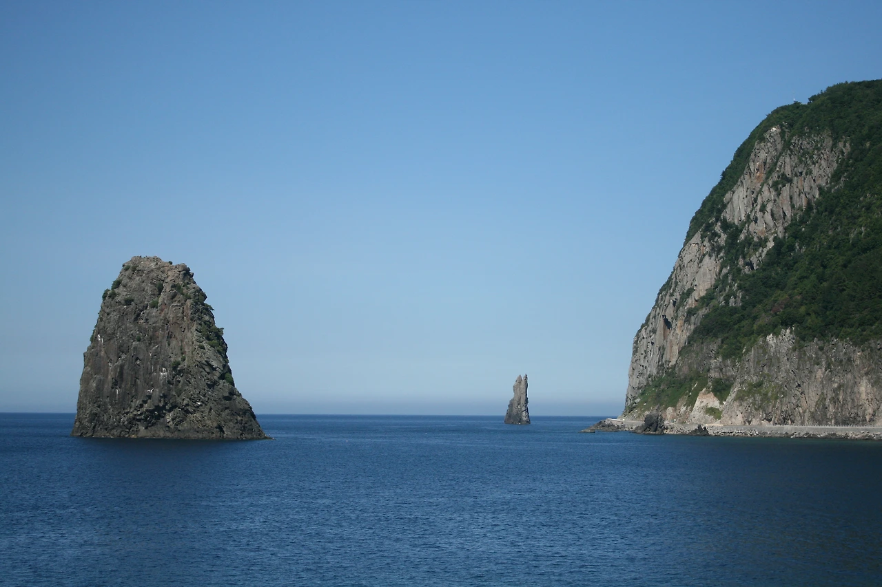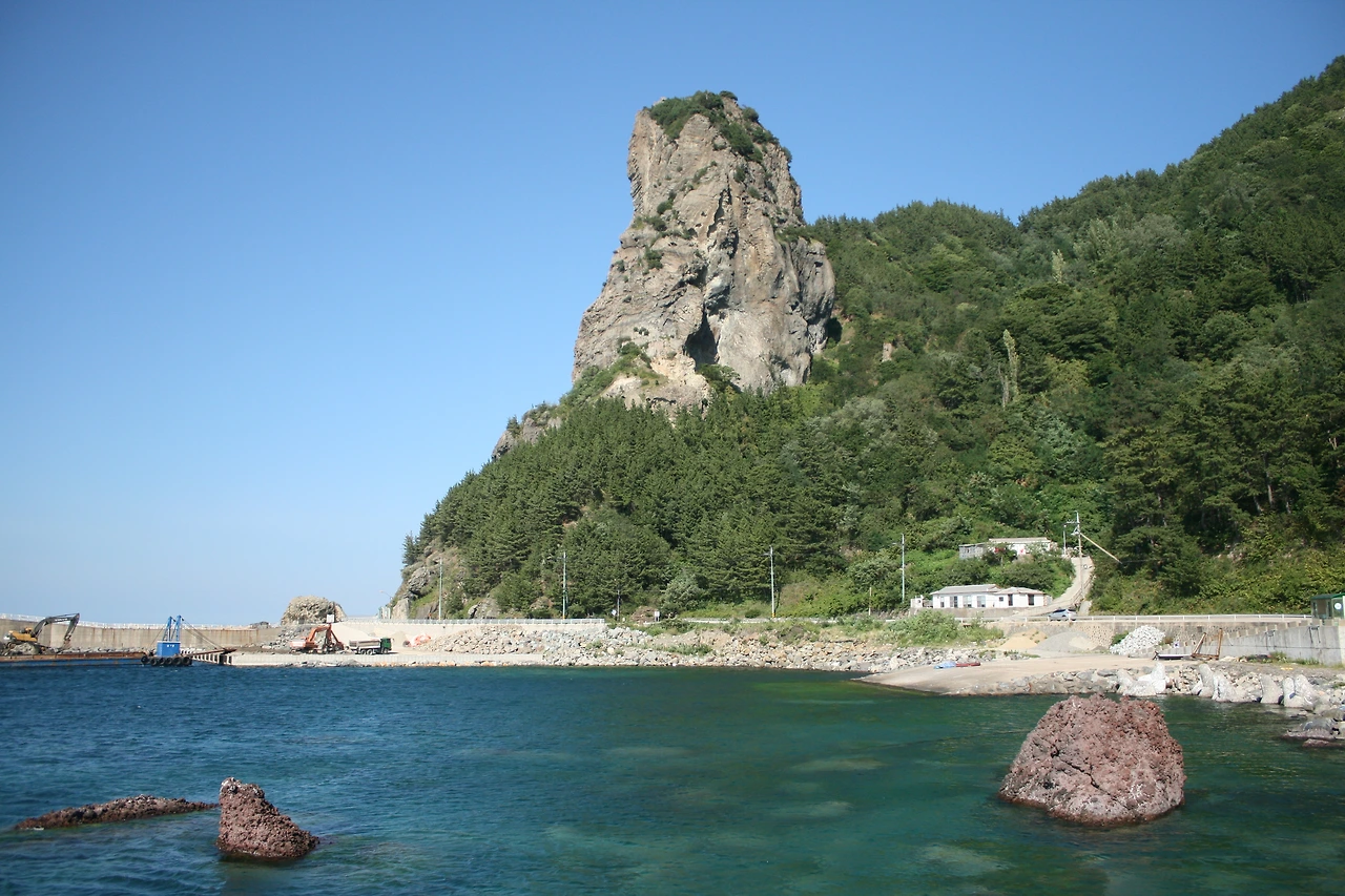 현포항에서 천부 쪽 방향을 바라보면 하늘로 커다랗게 솟은 바위 ‘노인봉’이 보인다.