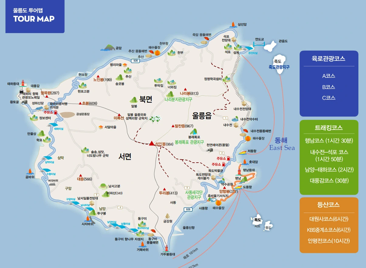 . 섬 최고봉 : 대한봉(서도 최고봉)168.5m, 우산봉(동도 최고봉) 98.6m