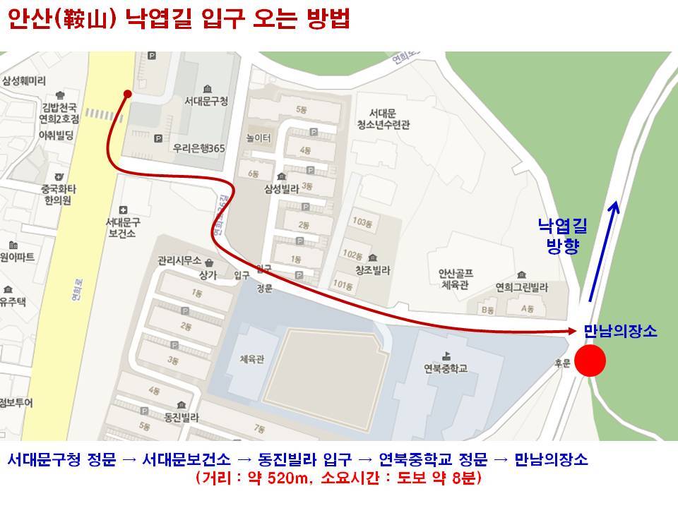 서대문구청에서 단풍길 입구까지 오는 방법은 서대문구청 정문에서 서대문보건소 사잇길로 올라가서 동진빌라 정문과 연북중학교 정문을 지나면 만남의 장소에 닿게 되는데 이곳이 단풍길의 출발지이다.