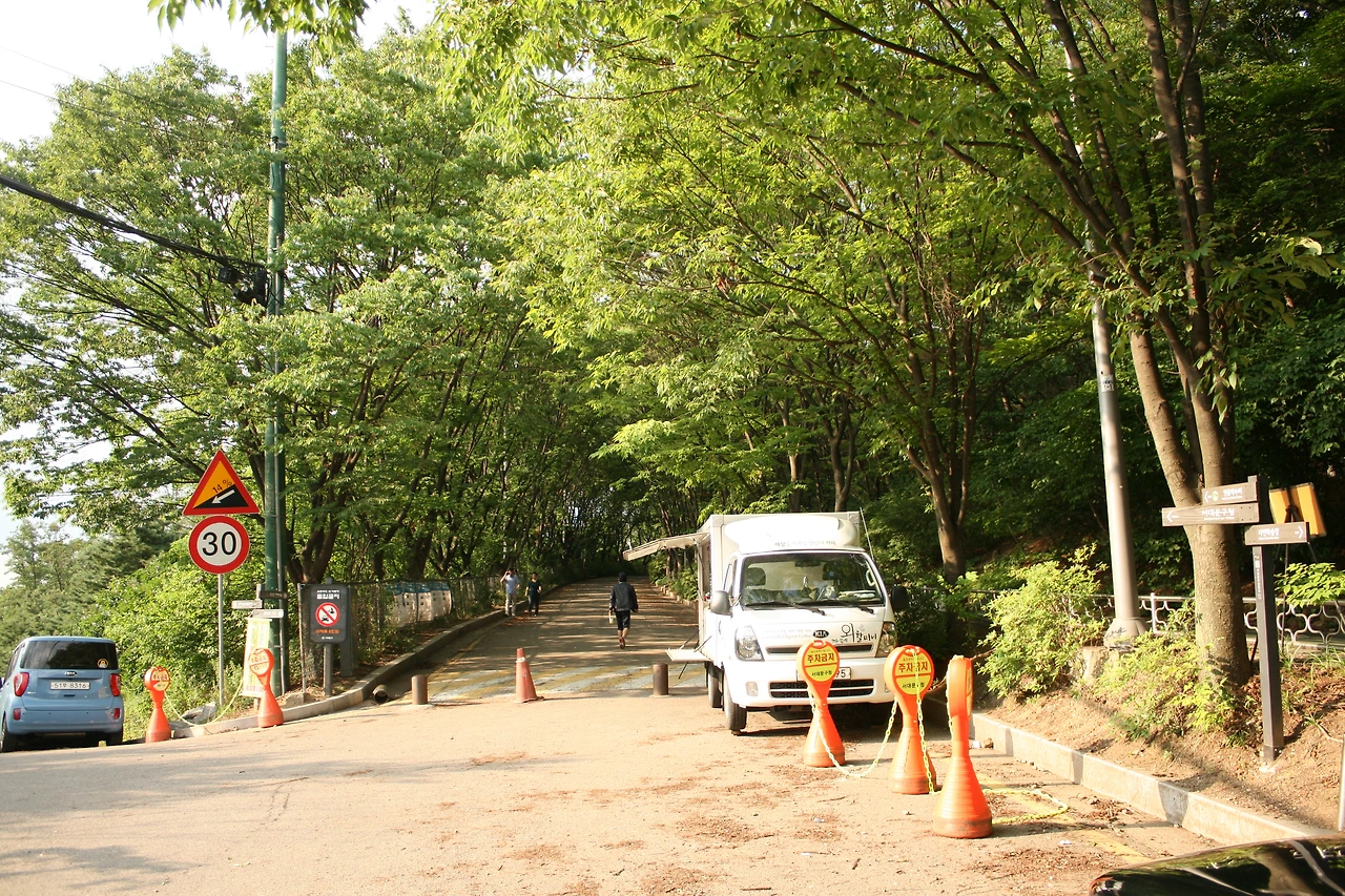 하늘을 가리듯 울창하게 서있는 나무들 사이로 아스팔트로 포장된 길이 이어진다. 예전에는 차들이 이 길을 따라 안산자락길 입구까지 진입이 가능해서 도로 갓길이 주차장이었다. 이 길이 알려지고 많은 시민들이 찾기 시작하면서 차량 출입을 통제하고 시민들이 편하게 걸을 수 있는 명품길로 조성되었다.