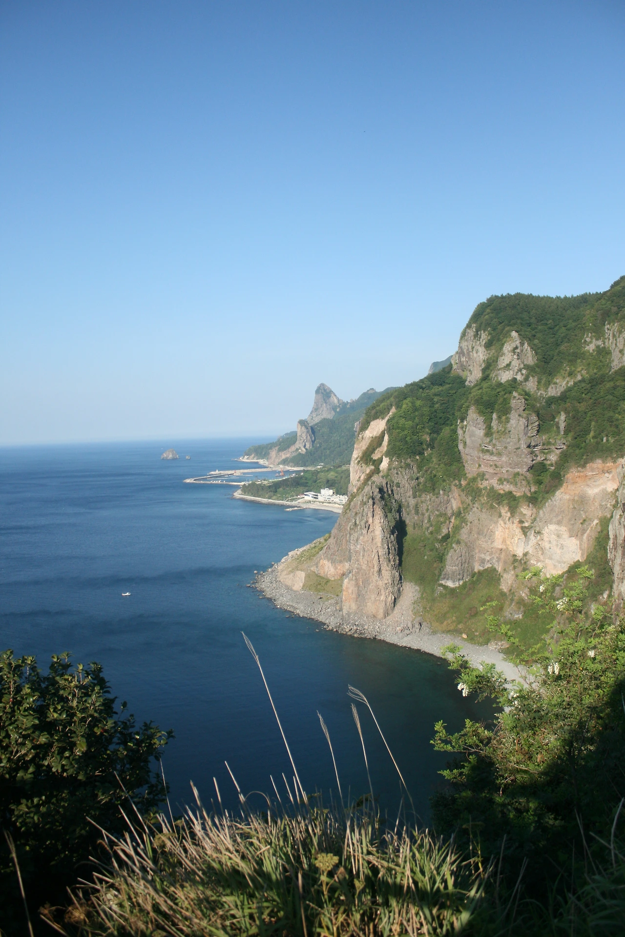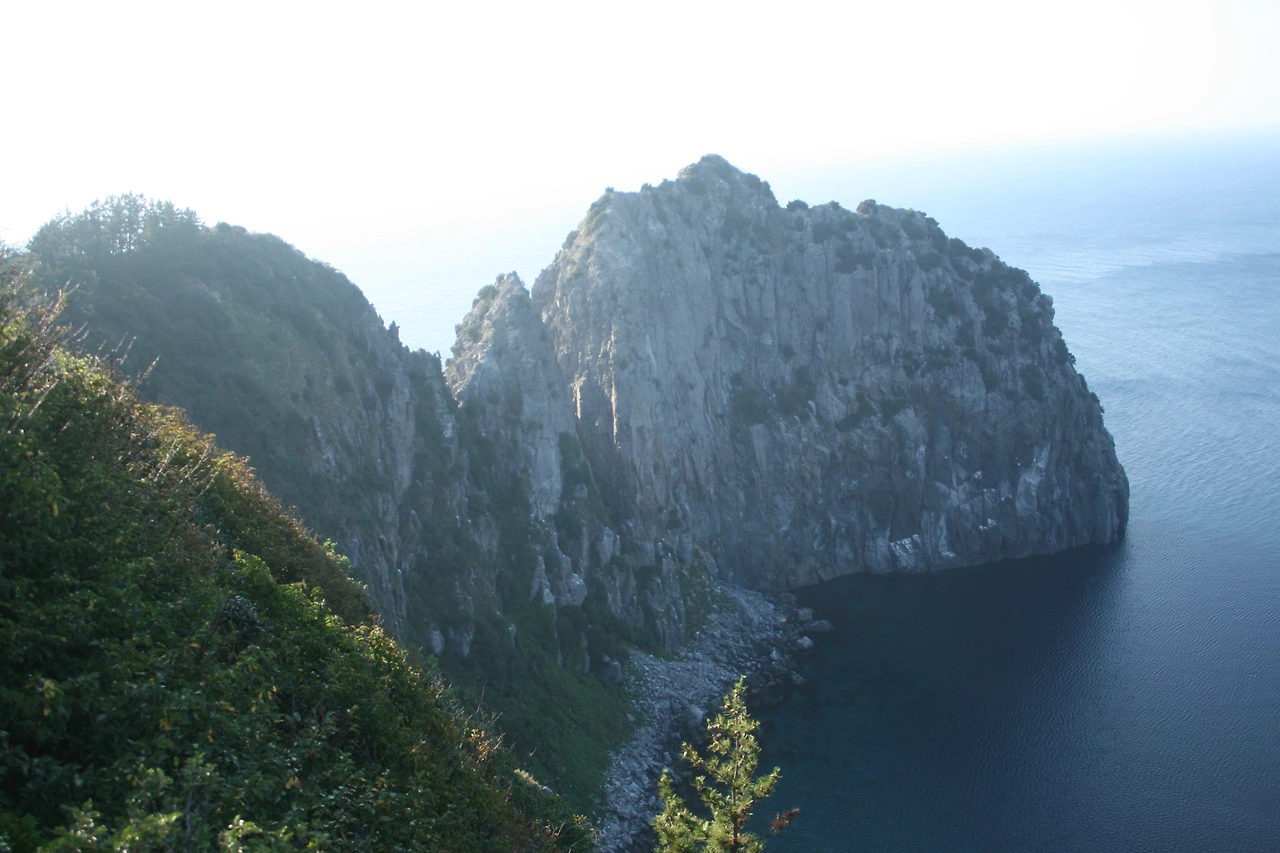 멀리 학포에서 태하로 이르는 길에는 바위들이 앞다투어 자기 모습을 뽐내며 깎아지른 절벽을 만들고 절벽 위에는 나무들이 그 푸르름을 더한다.