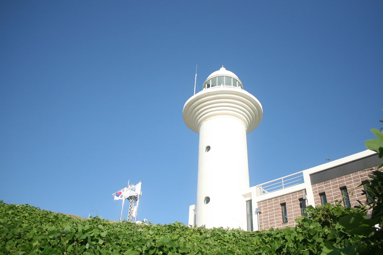 나무계단을 따라 숲길을 오르면 오른쪽으로 등대가 있는데 하얀색 등대와 파란 하늘의 조화가 멋지다.