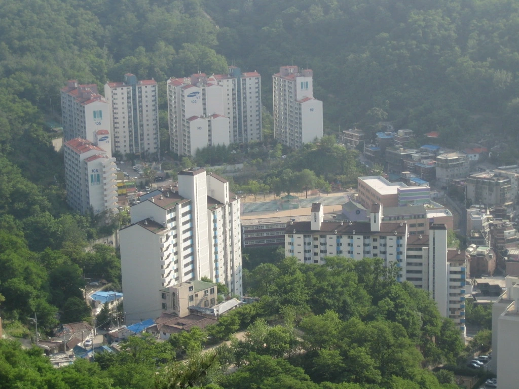 윗쪽 홍제삼성래미안아파트, 그 아래에 서울안산초등학교(운동장 주위)가 있고, 아래쪽으로 무악청구아파트가 보인다.