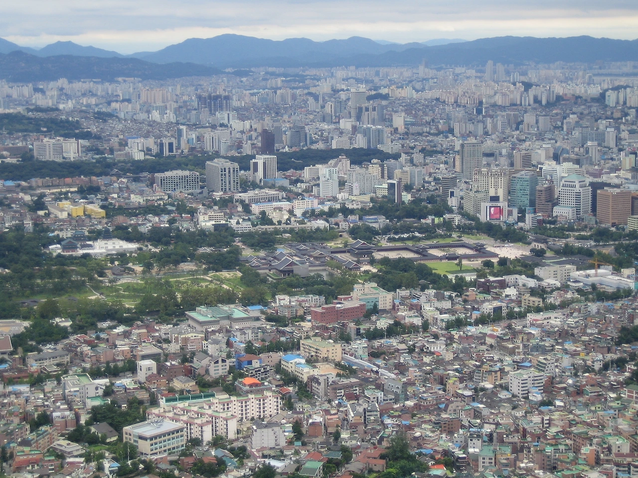 아래 가운데 광화문정부종합청사, 우측 아래 갈색빌딩이 교보빌딩이다. 빌딩과 아파트 숲으로 이어진 서울 도심이다.