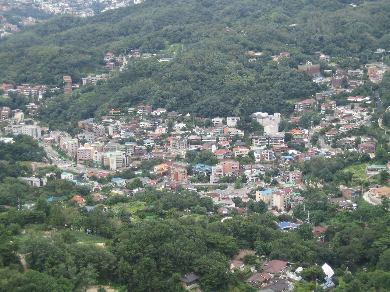 북한산의 보현봉과 문수봉(사진 위쪽), 그 아래에 고급 주택이 즐비한 평창동(사진 중앙), 세검정(사진 중간 아래) 풍경. 북한산의 턱 밑까지 파고든 건물들.