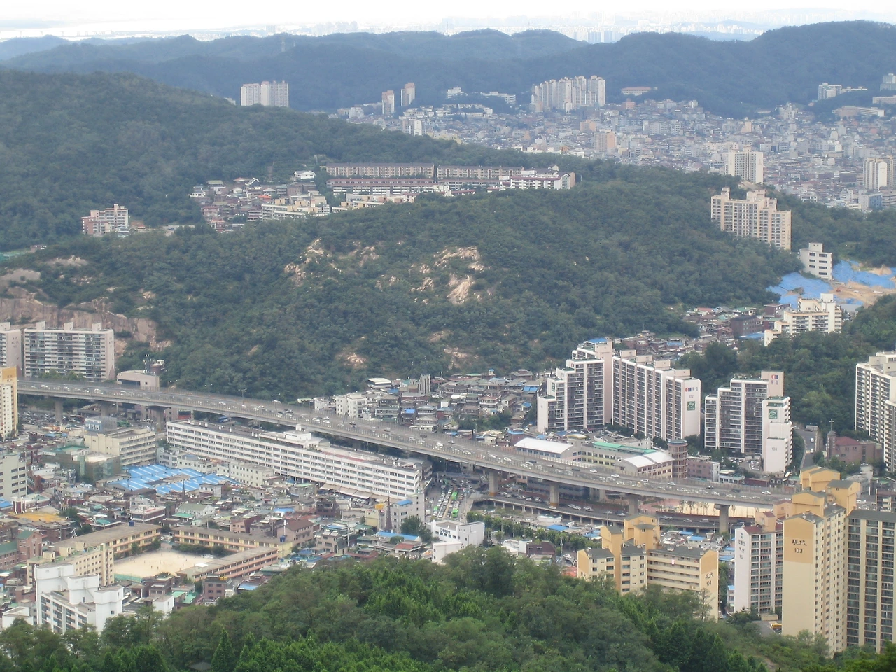 내가 사는 집 옥상에서 보면 내부순환도로(좌우로 이어진 도로)가 보인다. 좌측 아래 인왕초등학교와 그 위에 유진상가가 있다. 주택 대부분이 아파트단지로 재개발되고 있다.