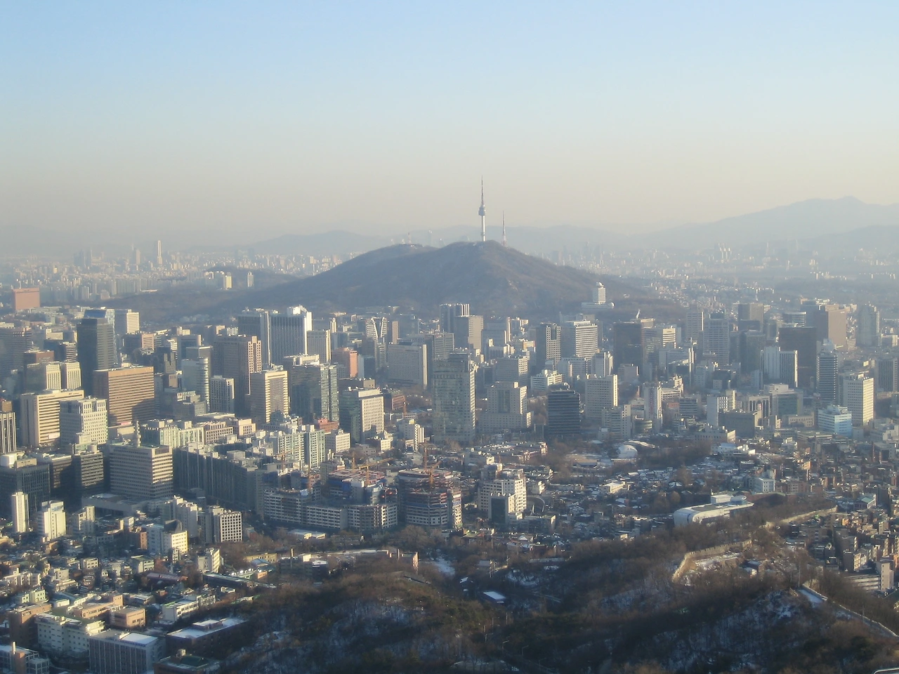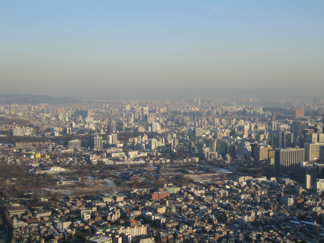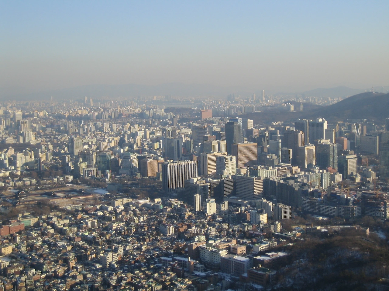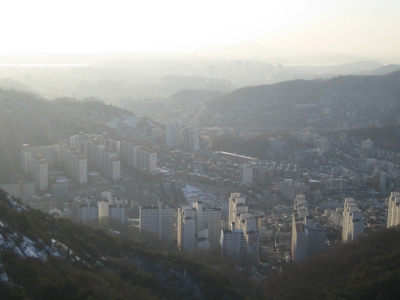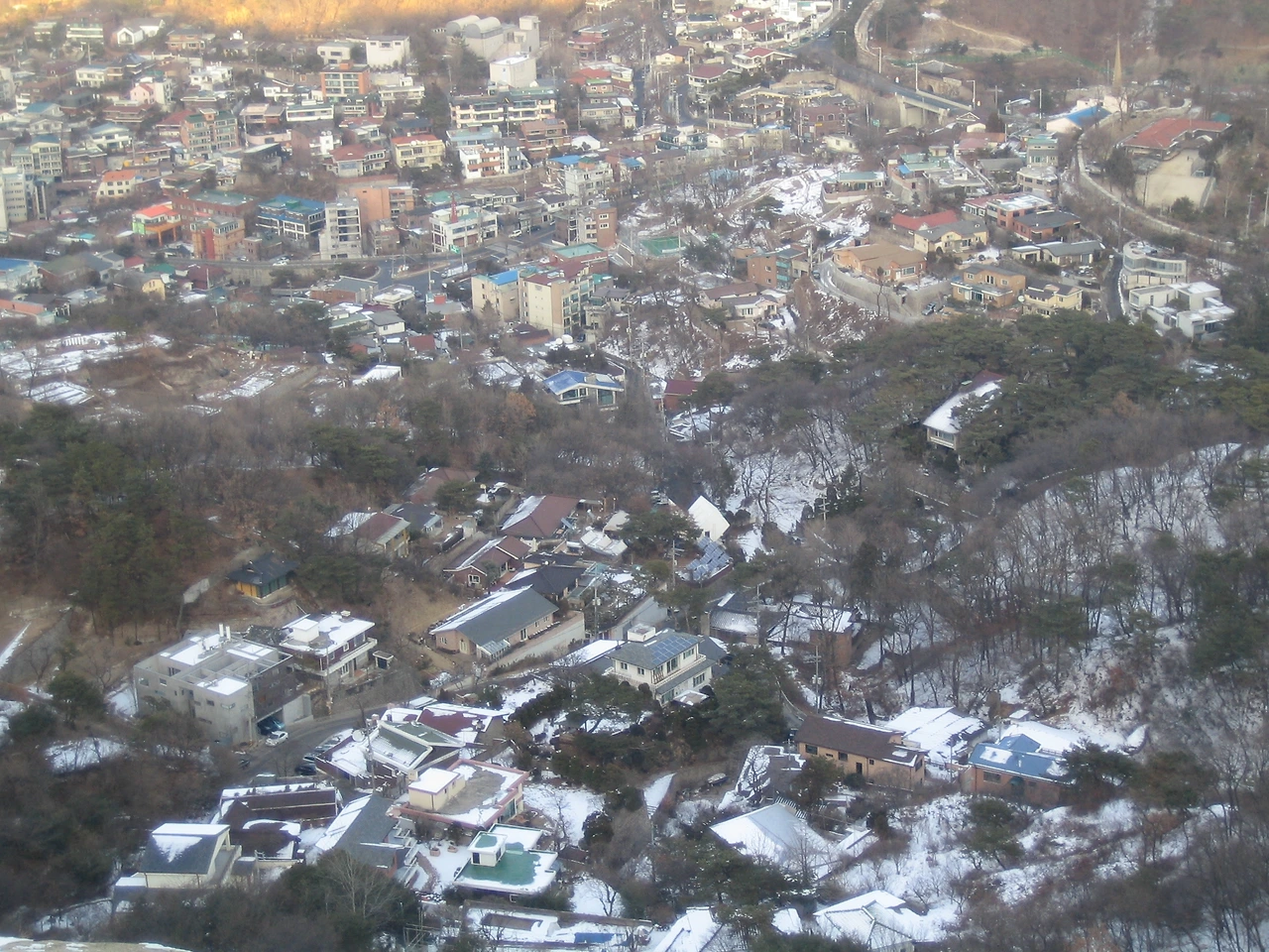 오른쪽 아래 산 옆에 있는 큰 건물이 배화여자대학교이다. 인왕산에서 가장 가까운 학교다. 우측 중간에 풍림아파트를 짓고 있다. 왼쪽 중간 경복궁 응달에도 눈이 그대로 쌓여있다.