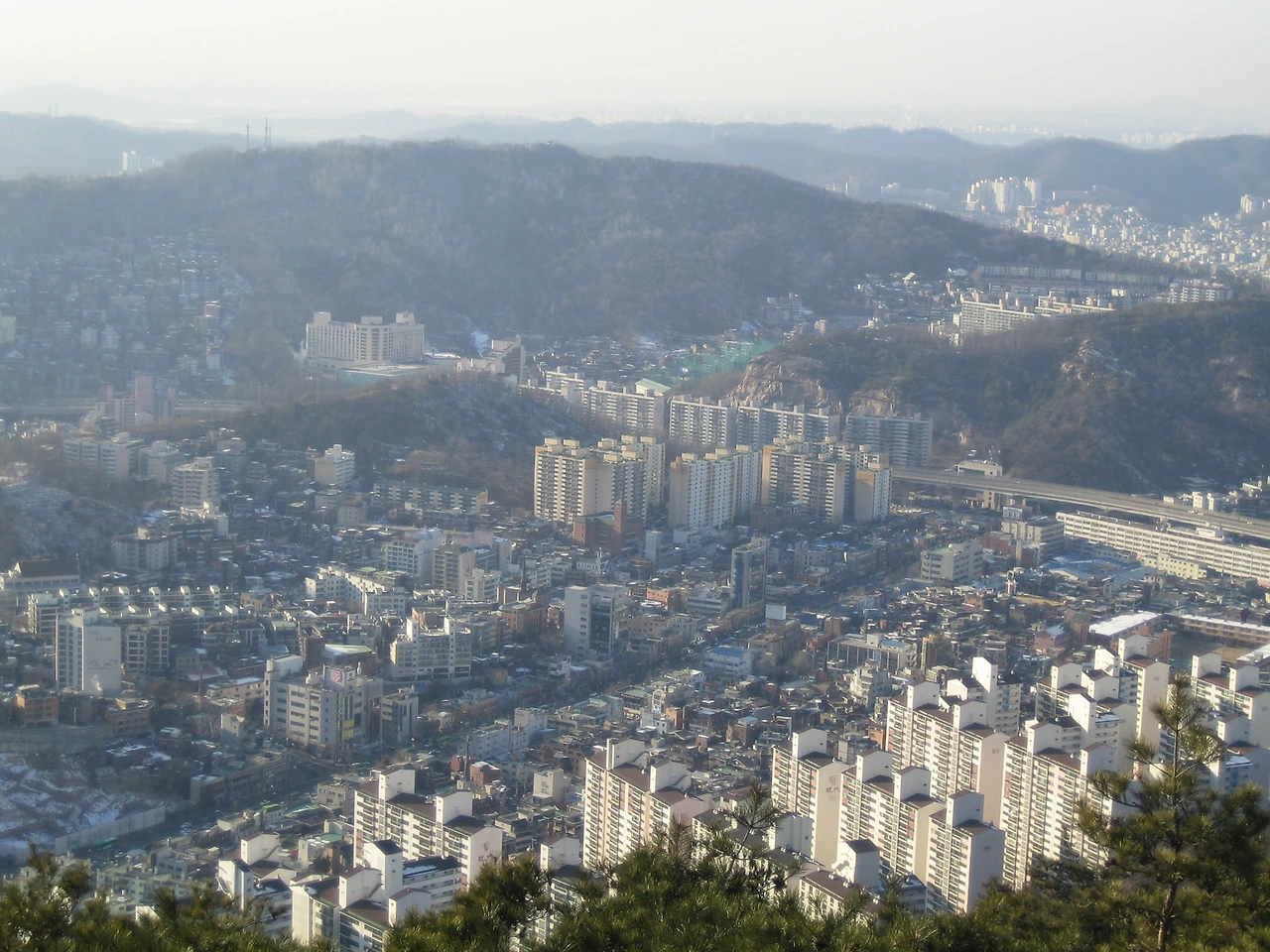 무악청구아파트에서 인왕산 정상으로 가는길. 왼쪽 위에 홍제한양아파트가 보이고 멀리 작은 산아래 홍은동이 보인다.
