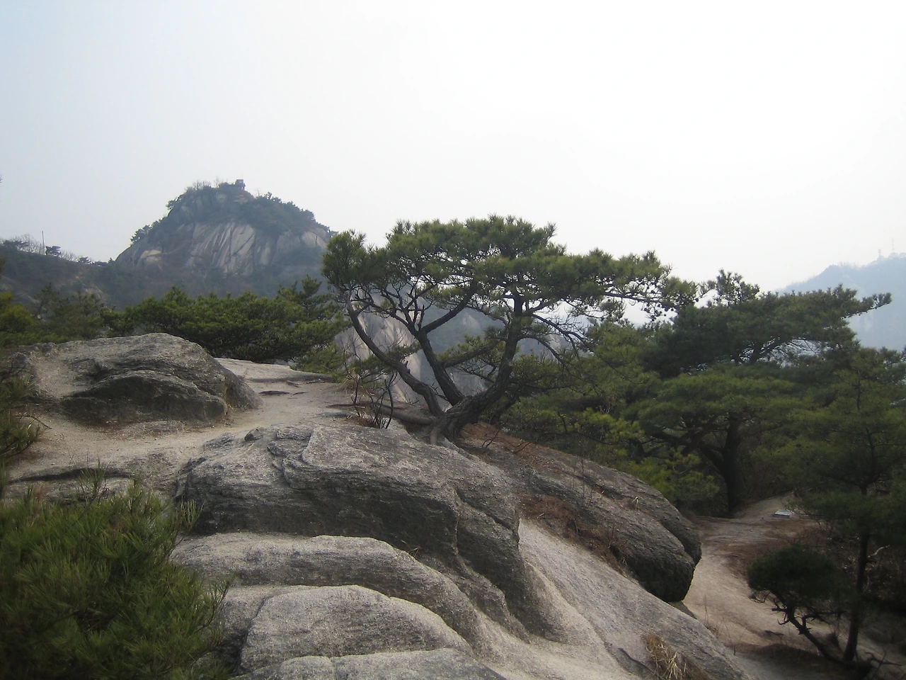 사람이었다면 저런 바위에 뿌리내리지 않았을 것이다. 척박한 바위에 뿌리를 내리고 긴 세월을 견뎌온 소나무에게서 삶의 진정성을 배운다. 멀리 인왕산 정상이 보인다.
