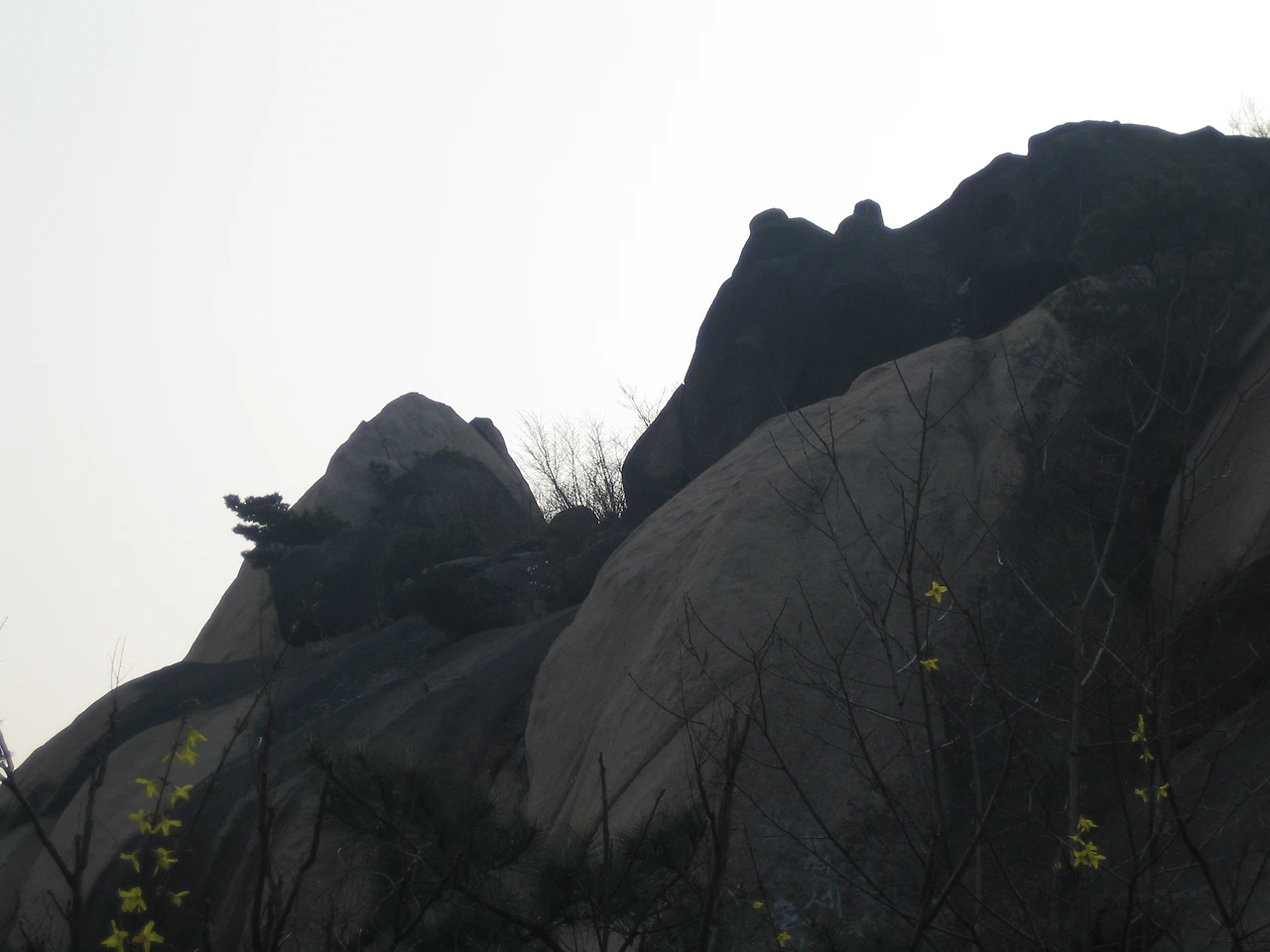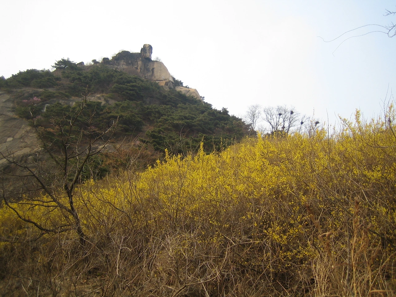 정상 아래에서 바라본 인왕산 정상. 무채색 바위에 핀 노란 개나리가 보는 이들의 마음에 기쁨을 주고 위로를 준다. 꽃은 사람의 마음을 치료하는 힘이 있다.