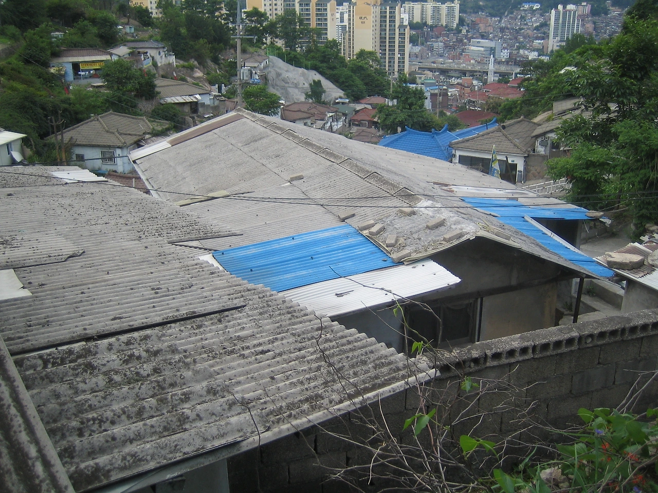 낡아서 깨진 기와와 구멍이 난 지붕