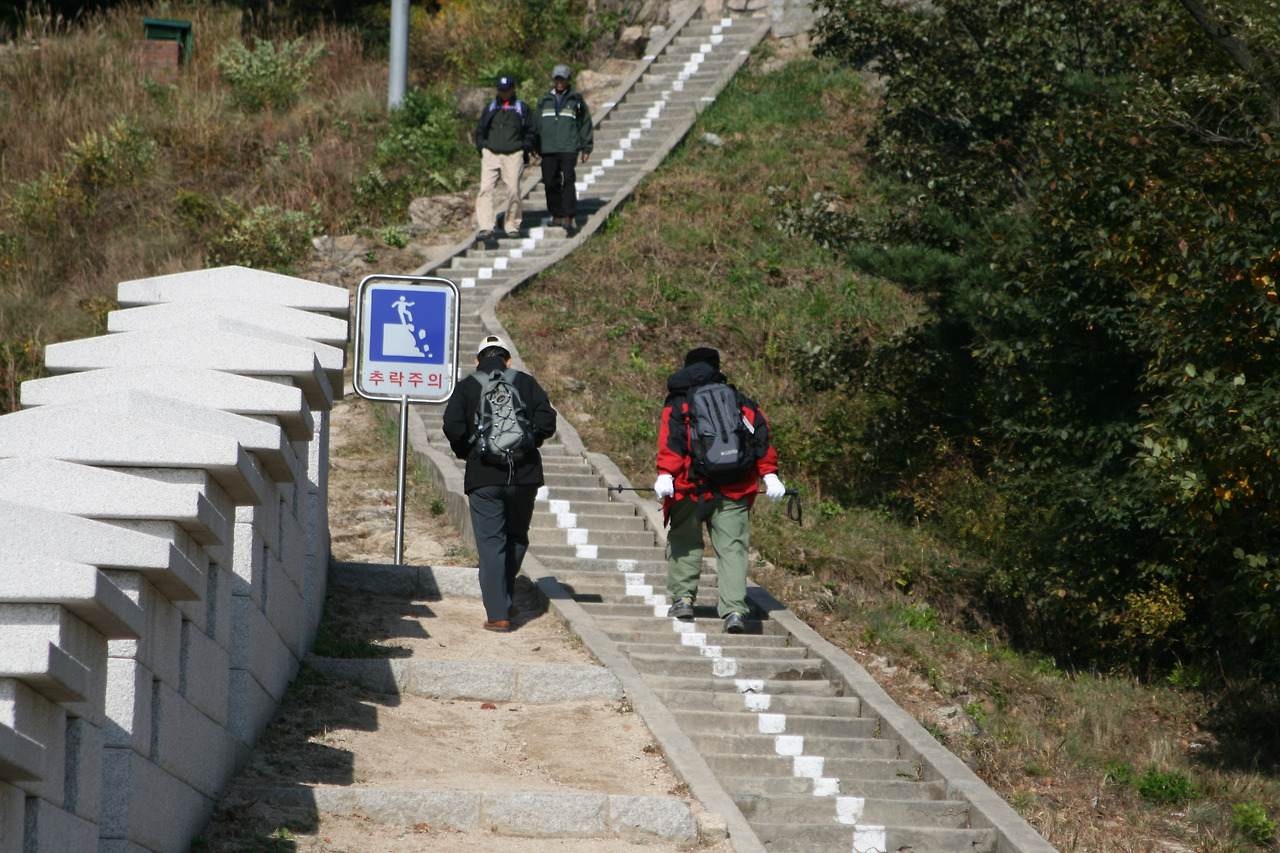 계단 가운데 흰줄을 무슨 의미일까? 좌측, 우측 통행일까? 아니면 정상으로 가는길을 이어주는 표시일까? 함께 가는 친구가 있어 행복하고 아름다운 길이다.