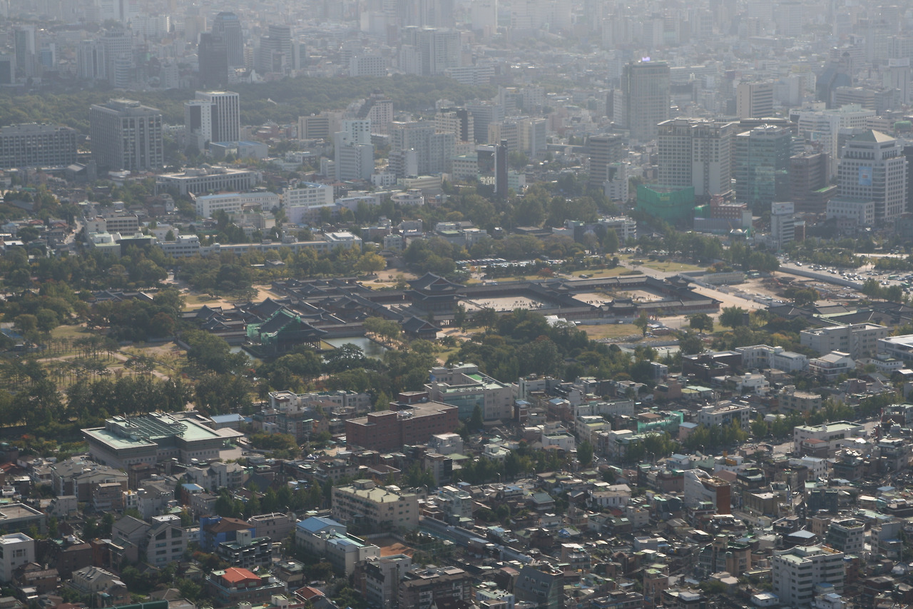 경복궁의 색도 노랗게 변해간다. 경회루(중앙) 지붕을 초록색 망으로 씌워 놓았다. 봄과 함께 새로운 경회루로 변화하기 위해 공사중이다.