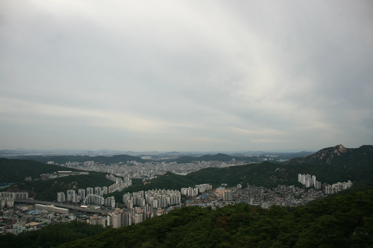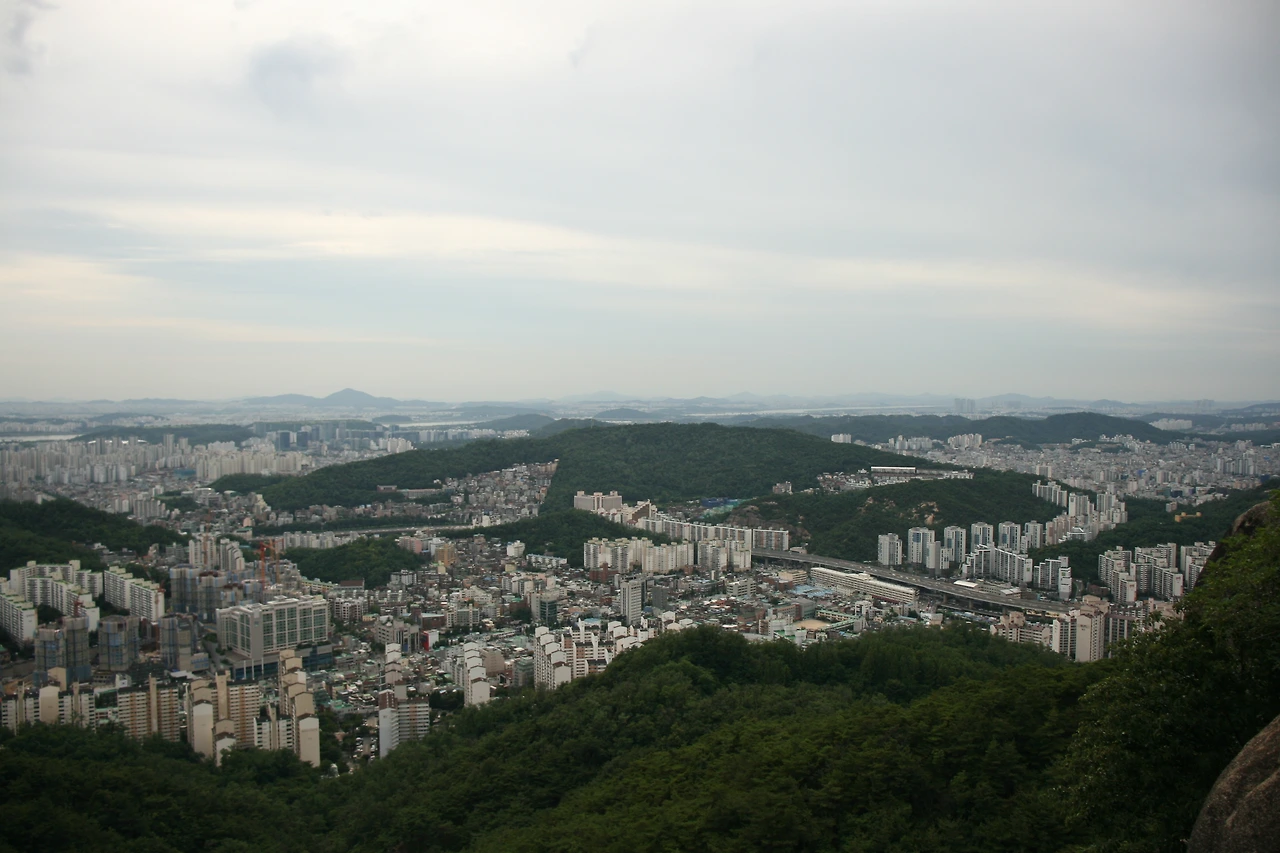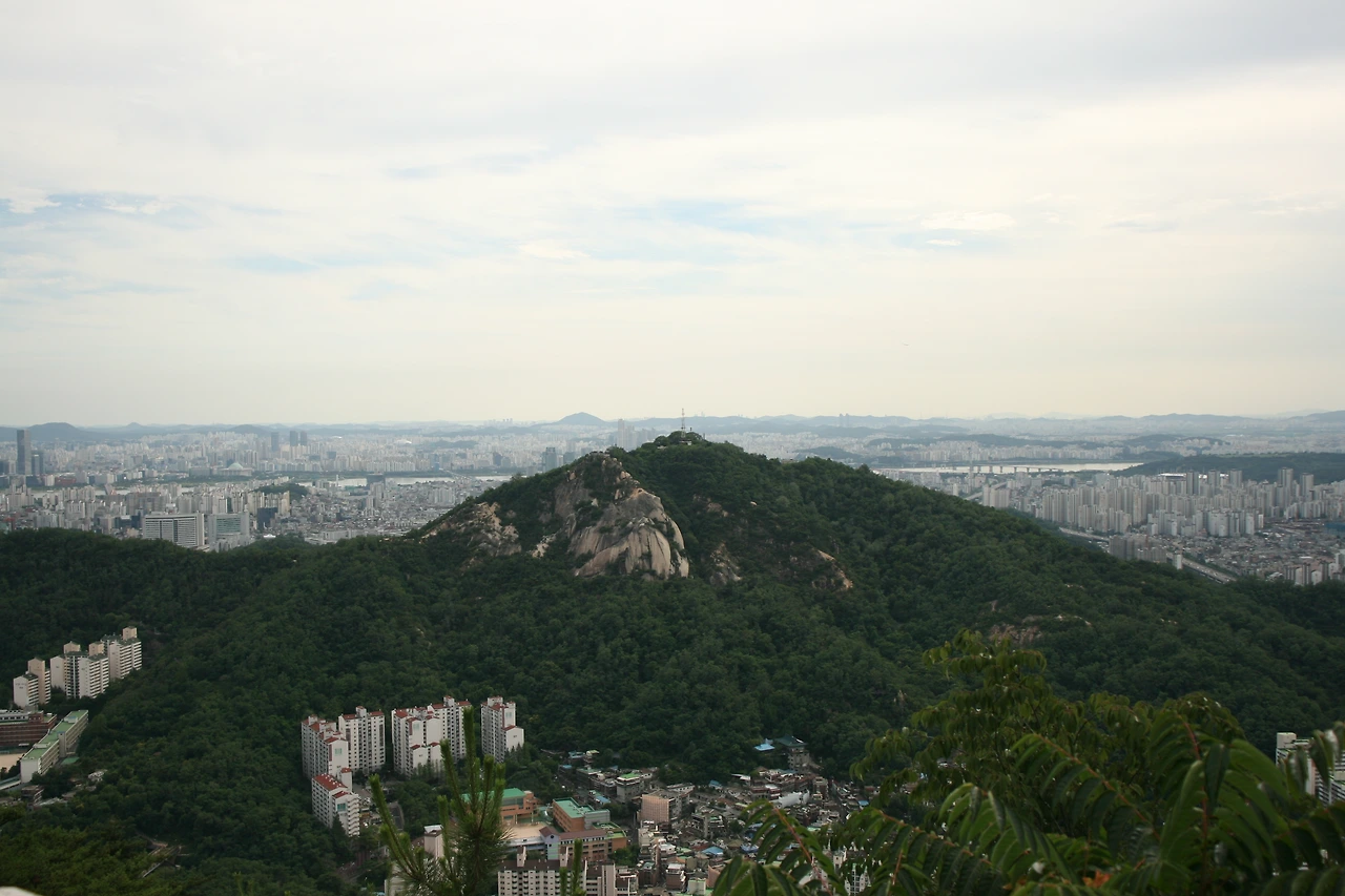 인왕산에서 바라본 안산 풍경, 안산 너머 마포구, 한강, 양천구, 강서구가 이어지고 멀리 인천의 계양산이 보인다. 날씨가 맑으면 멀리 서해 바다와 강화도가 보인다.