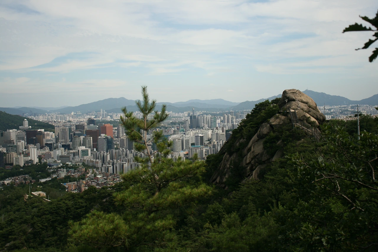 인왕산 중턱에서 바라본 성곽과 서대문구 풍경. 인왕산에서 서울 도심의 아름다움을 느낄 수 있는 곳이 이곳이다. 소나무 옆 바위에 앉아 바라보는 서울은 감동이다.