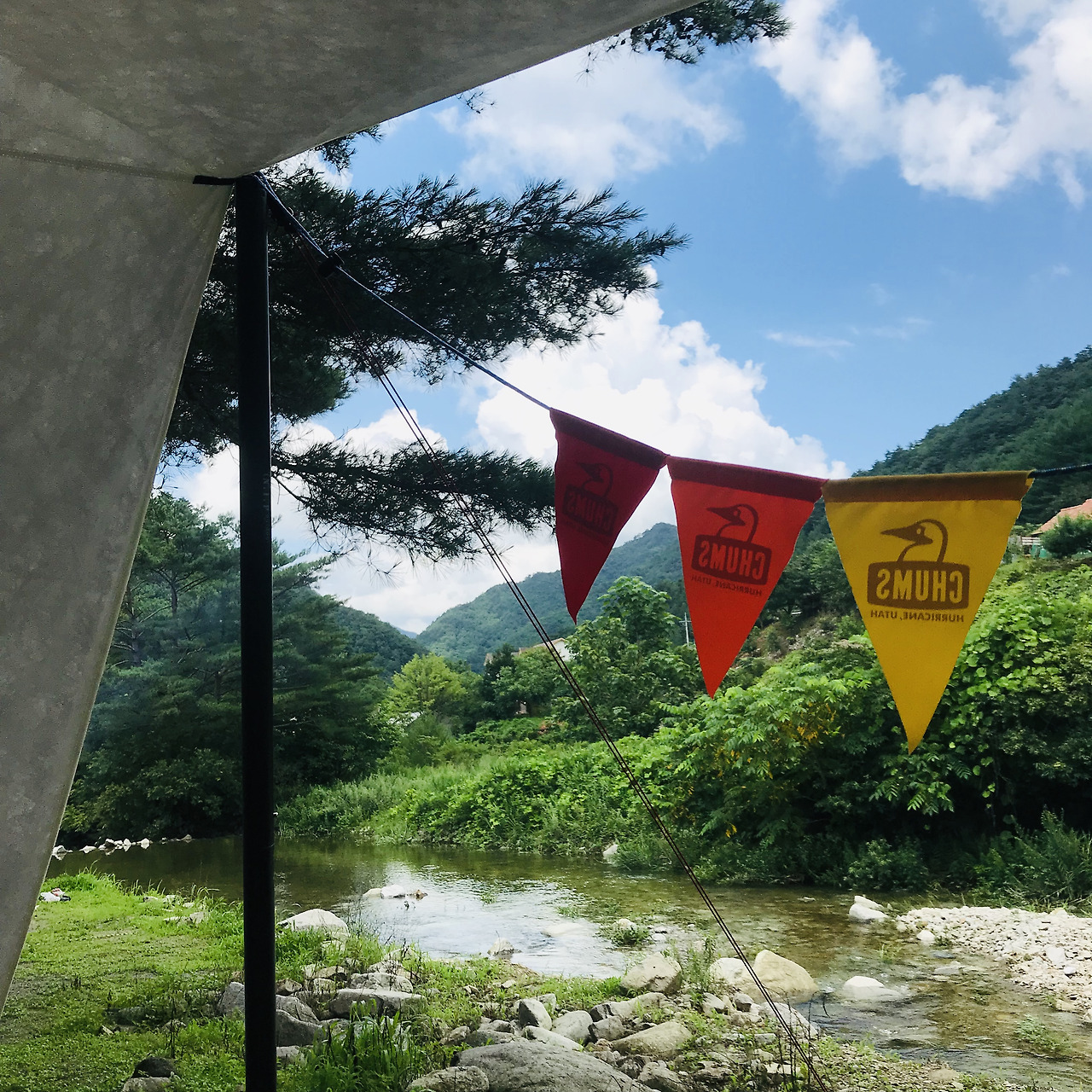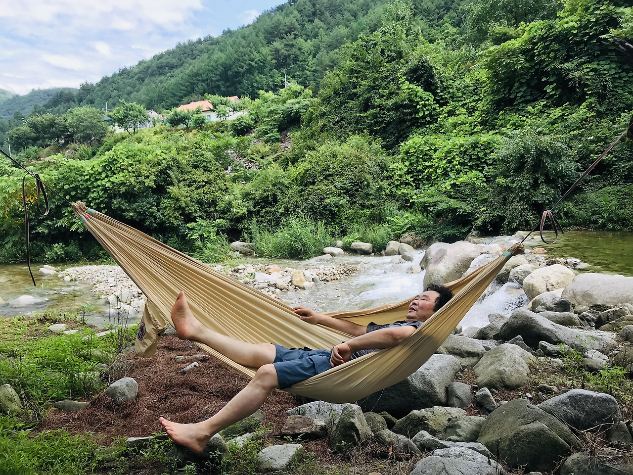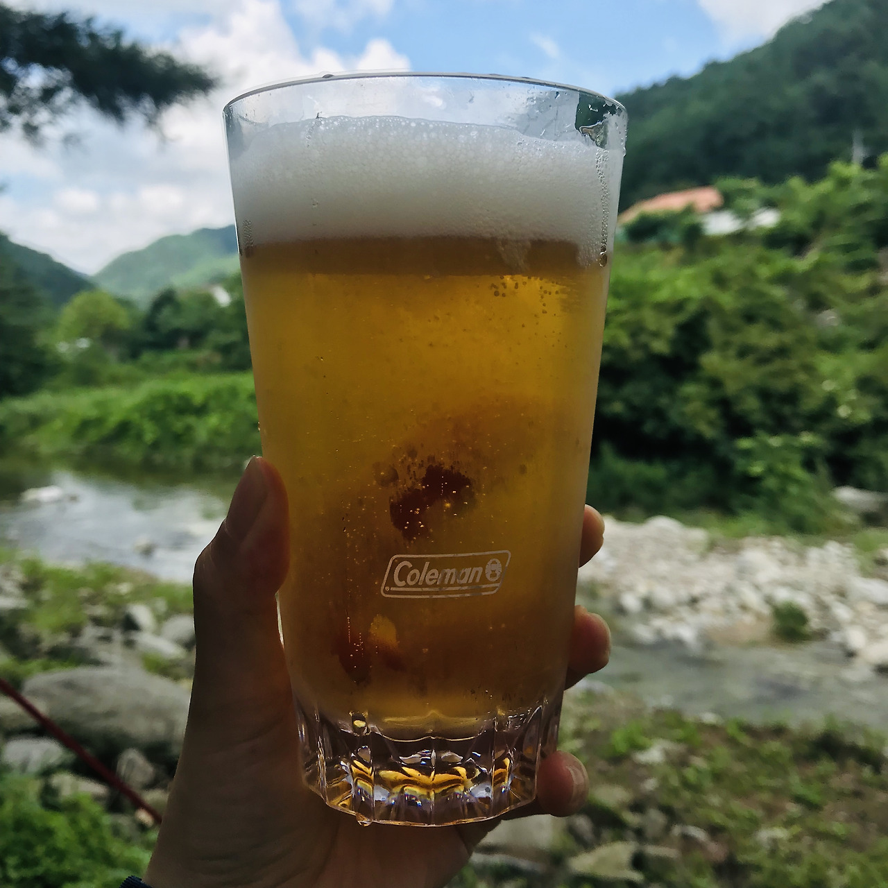 새롭게 준비한 간 해먹도 나무에 걸고, 계곡물에 들어가 놀았다. 7월 말의 갈천 계곡은 놀기 좋을 만큼 계곡물이 있었는데, 심각하게 차가워서 소리를 질러야 할 정도였다. (최근 매일같이 이어지는 서울의 폭염에 그 계곡물의 추위가 너무 그립다...) 저녁에는 남편이 정성스레 준비한 고기도 그릴에 굽고, 기분 좋고 풍족한 만찬을 즐겼다.