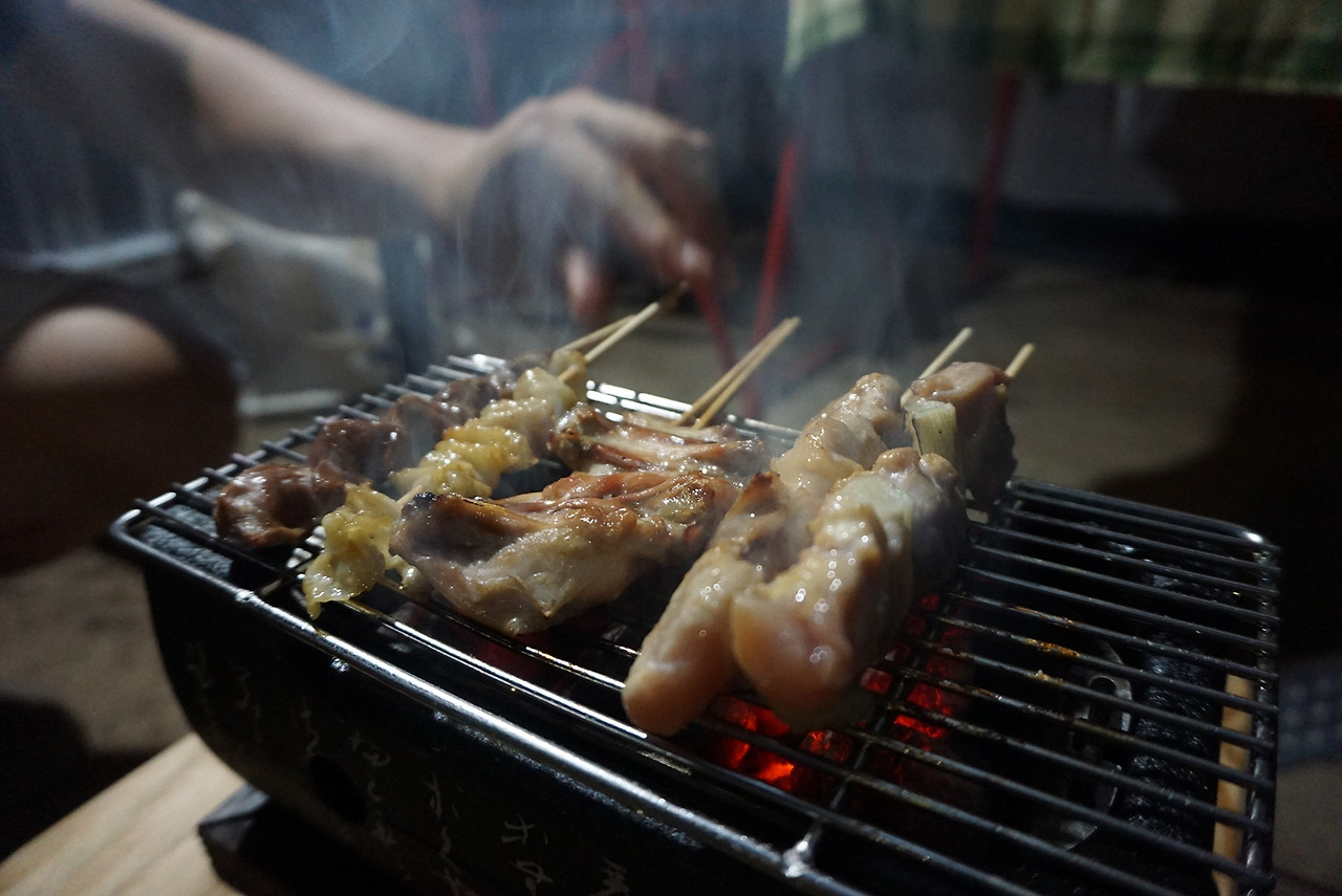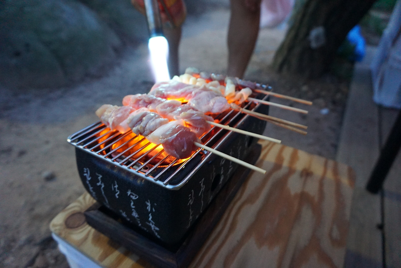 마트에서의 피신을 마치고 더위가 조금 수그러들 무렵, 저녁 먹을 준비를 하러 캠핑장으로 돌아왔다. 오늘은 예전에 친구에게서 집들이 선물로 받고 쓸 일이 별로 없었던 미니 화로에 꼬치구이를 해 먹기로 했다. 집에 있는 위스키와 토닉워터, 레몬도 챙겨 와서 하이볼을 만들어 야무지게 마셨다. 꼬치구이와 하이볼의 조합은 두 말하면 입 아프다.