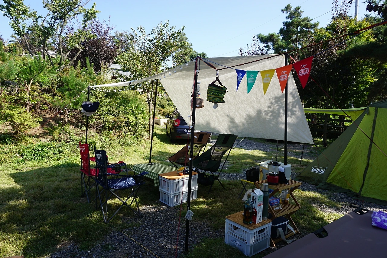 캠핑장에 도착해 두 사이트를 연결해서 사용할 수 있는 곳에 자리를 잡았다. 캠핑장 근처를 산책해보는 것도 추천해주셔서 천천히 걸으며 한적한 동검도의 동네를 구경했다. 적당하게 시원한 온도에 맑은 하늘까지, 역시 캠핑은 날씨빨이다!
