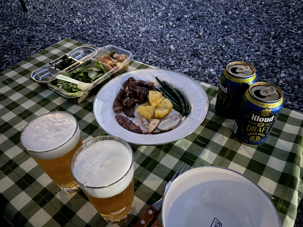 아이가 잠들고 남은 소고기를 구웠다. 아까 아이가 잠들기 전 매점에 맥주를 사러 갔는데, 아기 재우고 맥주를 마실 거라고 했더니 사장님은 스티로폼 상자에 아이스팩과 맥주를 같이 넣어주셨다. 센스가 보통이 아니시다.