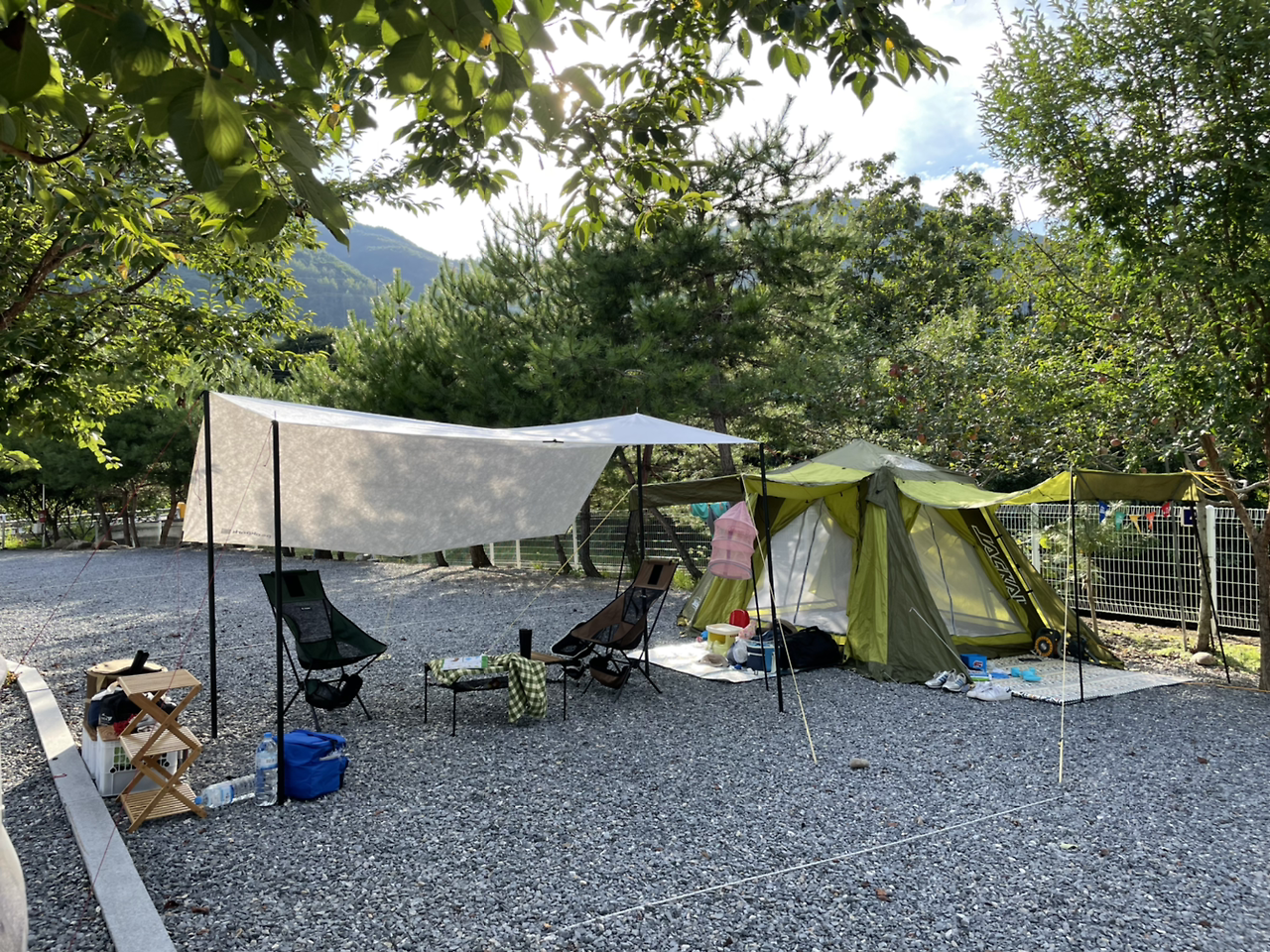 시아버지는 창고에 넣어뒀던 캠핑용품을 캠핑장으로 가져다주셨다. 그리고 남편이 텐트와 타프를 피칭하는 걸 도와주고 가셨는데, 그 도움의 손길이 굉장히 큰 힘이 되었다.