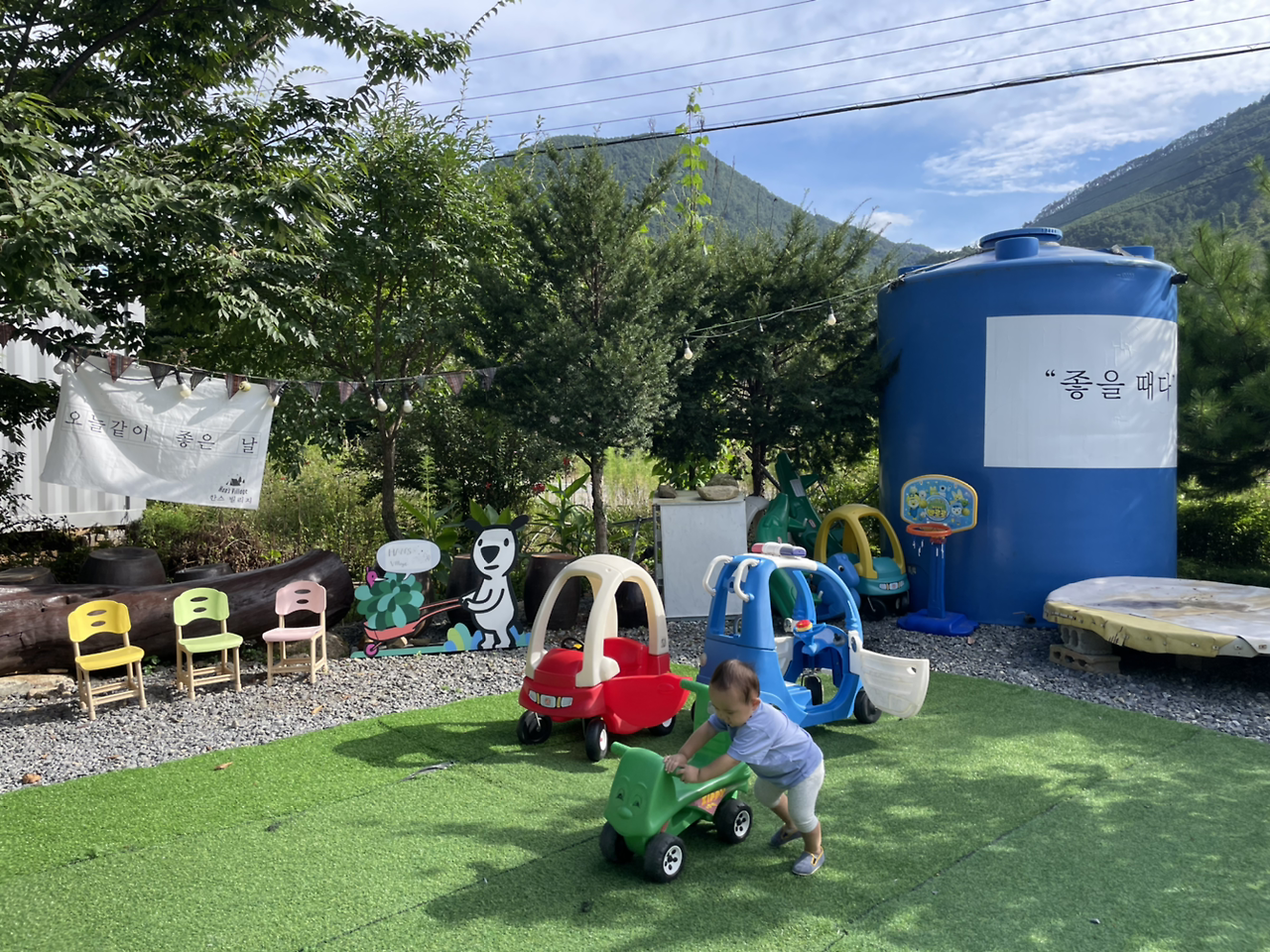 돌멩이만 가지고도 잘 노는 아이는 캠핑장에 놓여있는 자동차 장난감들을 가지고 놀기도 하고, 캠핑장 옆에 바로 흐르고 있는 계곡에서 물놀이도 했다. 우리가 예약한 캠핑장에는 아이들이 모래놀이를 할 수 있는 공간도 있었고, 트램펄린을 탈 수도 있어서 아이 동반 캠핑에 더없이 좋을 장소였다.