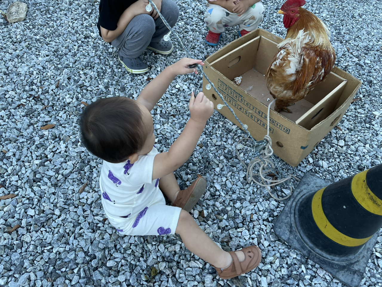 그래서 이날도 아이가 오늘 밤에 잘 자줄까 하는 기대 반 염려 반으로 캠핑을 떠났는데, 심지어 예상치 못했던 기차마저 지나다닌다. 그런데 아이는 의외로 기차 소리에 아랑곳 않고 잘 놀았다. 나의 괜한 노파심이었나, 아이 귀에는 소리가 크게 안 들리나 보다 생각했다.(그럴 리가 없잖아) 캠핑 가면 바닥에 굴러다니는 파쇄석만 있어도 잘 노는 아이여서 돌을 가지고 놀거나, 캠핑장에 있는 닭, 고양이들도 구경하며 시간을 보냈다.