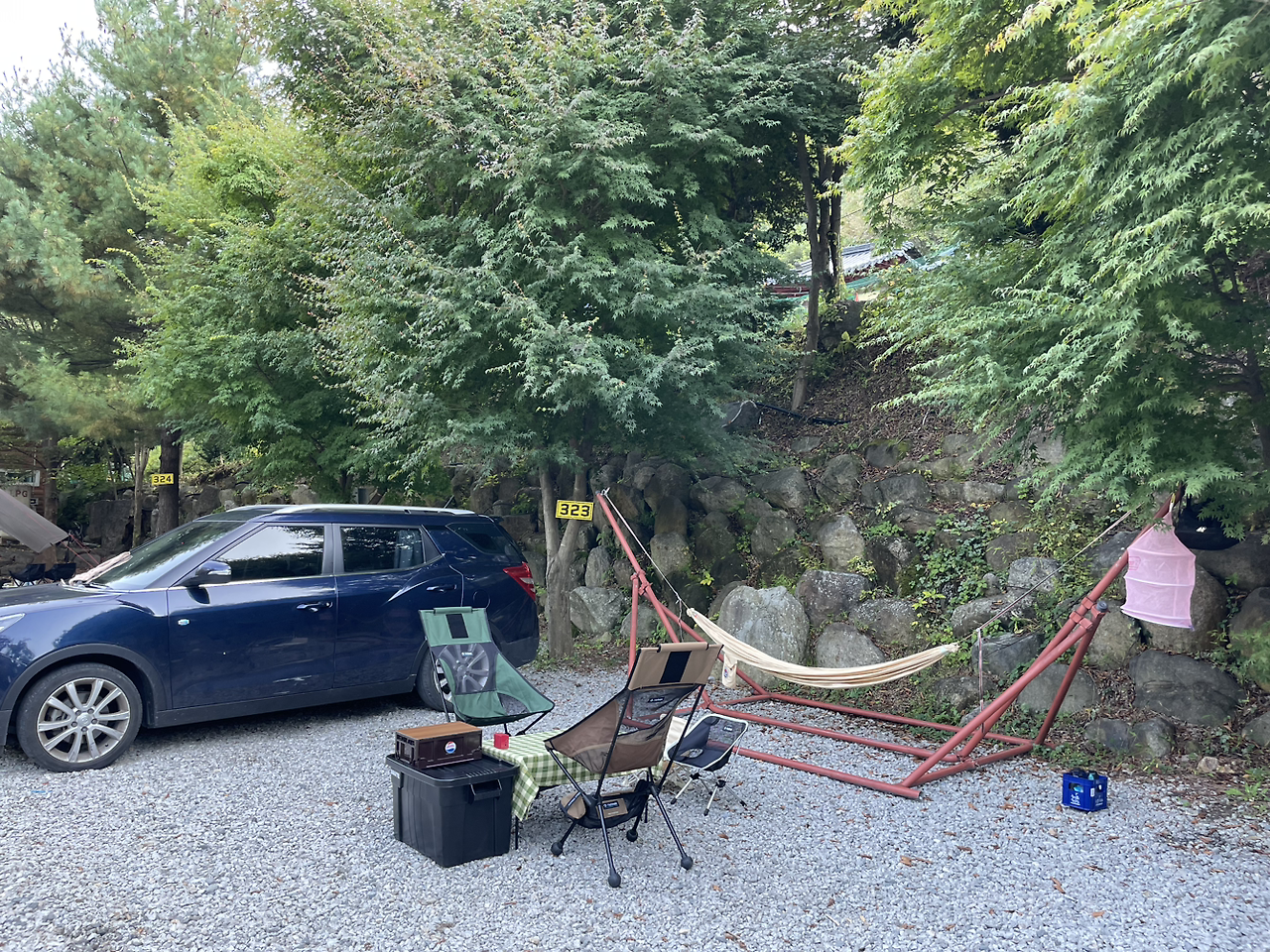 우리는 323번 사이트를 이용했는데, 캠핑장 사이트가 옆으로 길쭉한 모양인 게 특이했다. 사이트가 넓어서 차를 세우고 텐트를 치고 바깥에 테이블을 놓아도 공간이 남는다. 그 덕에 사이트 간격이 넓어서 좋았다. 사이트 내에는 해먹 스탠드도 있어서 해먹이 있다면 걸어둘 수도 있다.