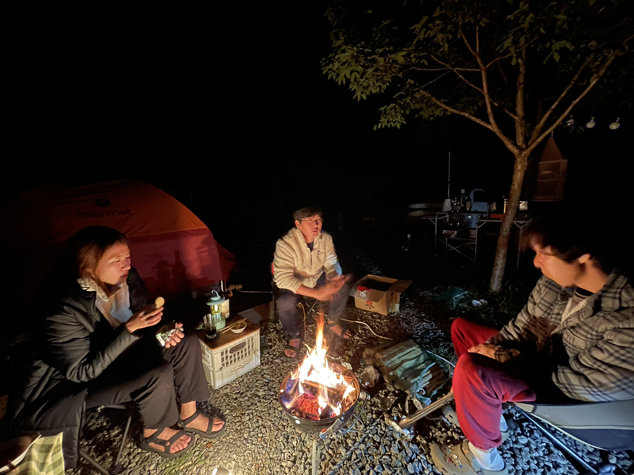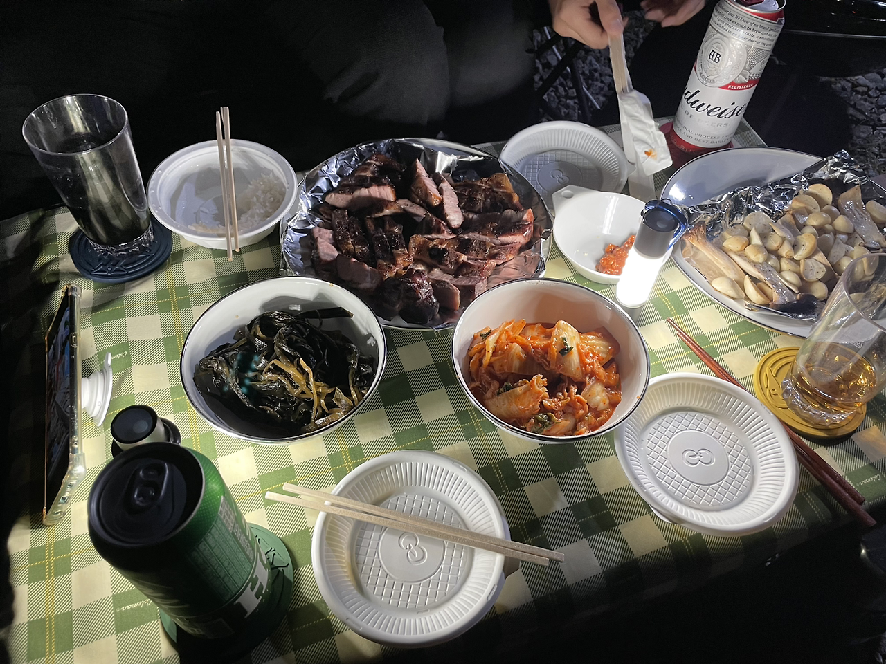 친구 부부가 준비해온 가리비로 찜도 해 먹고, 좀처럼 사용하지 않는 그릴을 야심차게 챙겨 와 닭고기, 돼지고기도 구워 먹었다. 치킨, 닭강정, 컵라면이 주식이었던 우리 캠핑의 식사메뉴가 이렇게 확장될 수 있다니 감격적이었다.