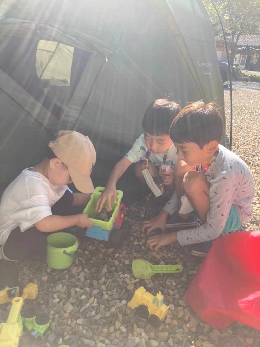 친구 부부는 아직 아이가 없음에도 불구하고 아이와 함께 너무 잘 놀아줬다. 아이 역시 낯을 안 가리는 인싸 기질(ㅋㅋ)이 있어서 이모, 삼촌을 잘 따랐다. 그 덕분에 남편과 나는 육아에서 잠시 벗어나 캠핑 살림살이들 셋팅에 전념할 수 있었다.